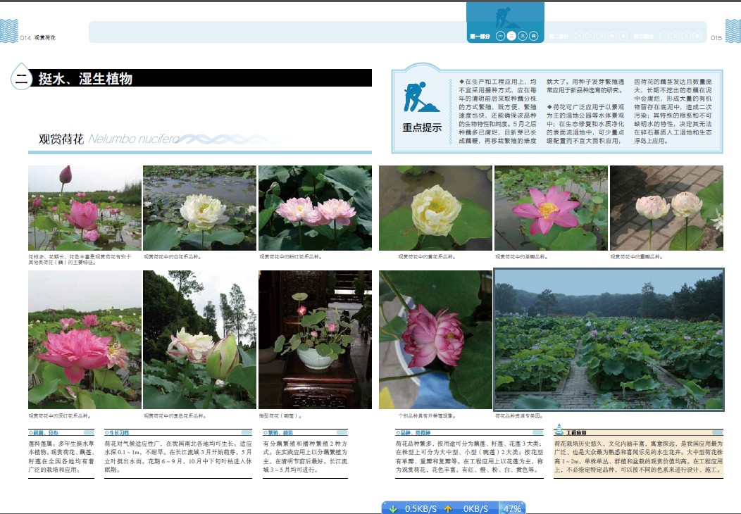 第一部分“水生植物主要应用品种”,以“极具应用价值、实践操作性强”为原则,推荐了37 种水生植物。在品种特性和应用技术介绍上,淡化了一些理论和常识性的内容,重点强调了与实践应用密切相关的技术方法和应用经验;每种植物都配有彩图,并在不同类型的应用领域均有展示,以便读者能直观地识别植物和感知其在相关工程上的实际应用效果。