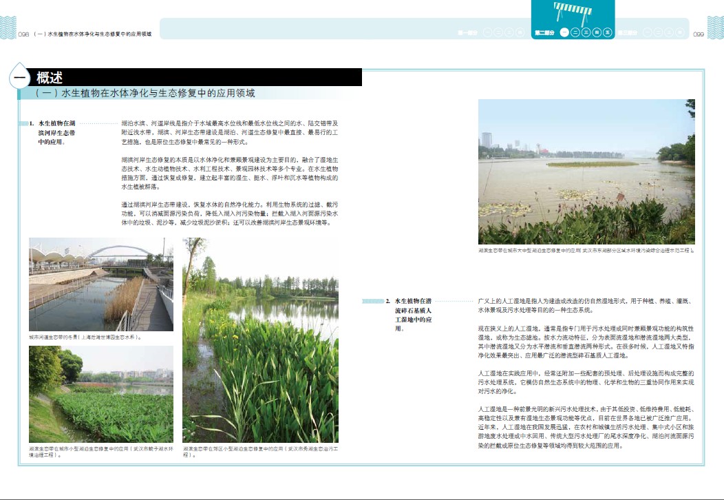 第二部分“水生植物在水体净化与生态修复中的应用”,细分为“湖滨河岸生态带”、“潜流碎石基质人工湿地”、“表面流土壤基质人工湿地”和“生态浮岛”4 个应用领域。