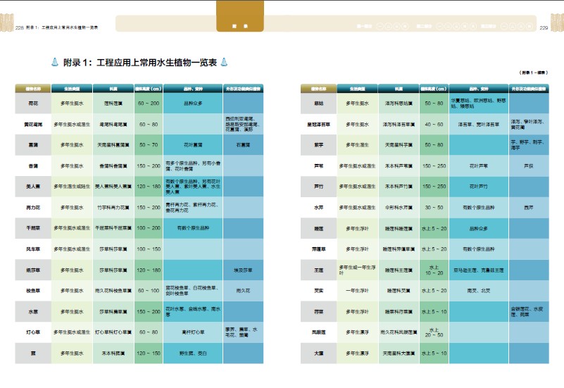 第二部分和第三部分均是结合大量实践应用案例进行分析和阐述,配有治理或施工前后、不同生长期的现场实景彩图,并用“施工心得”、“设计施工建议”、“工程反思”等形式重要总结水生植物在各个应用领域的实践技术和经验。“附录”部分是3个表格,以一目了然的方式介绍了水生植物主要应用品种的生物特性、品种类似种、繁殖方式、应用移栽时间、栽种密度、能越冬地区、适宜水深及适应基质等方面的参数或建议。