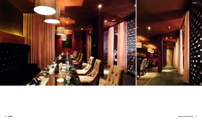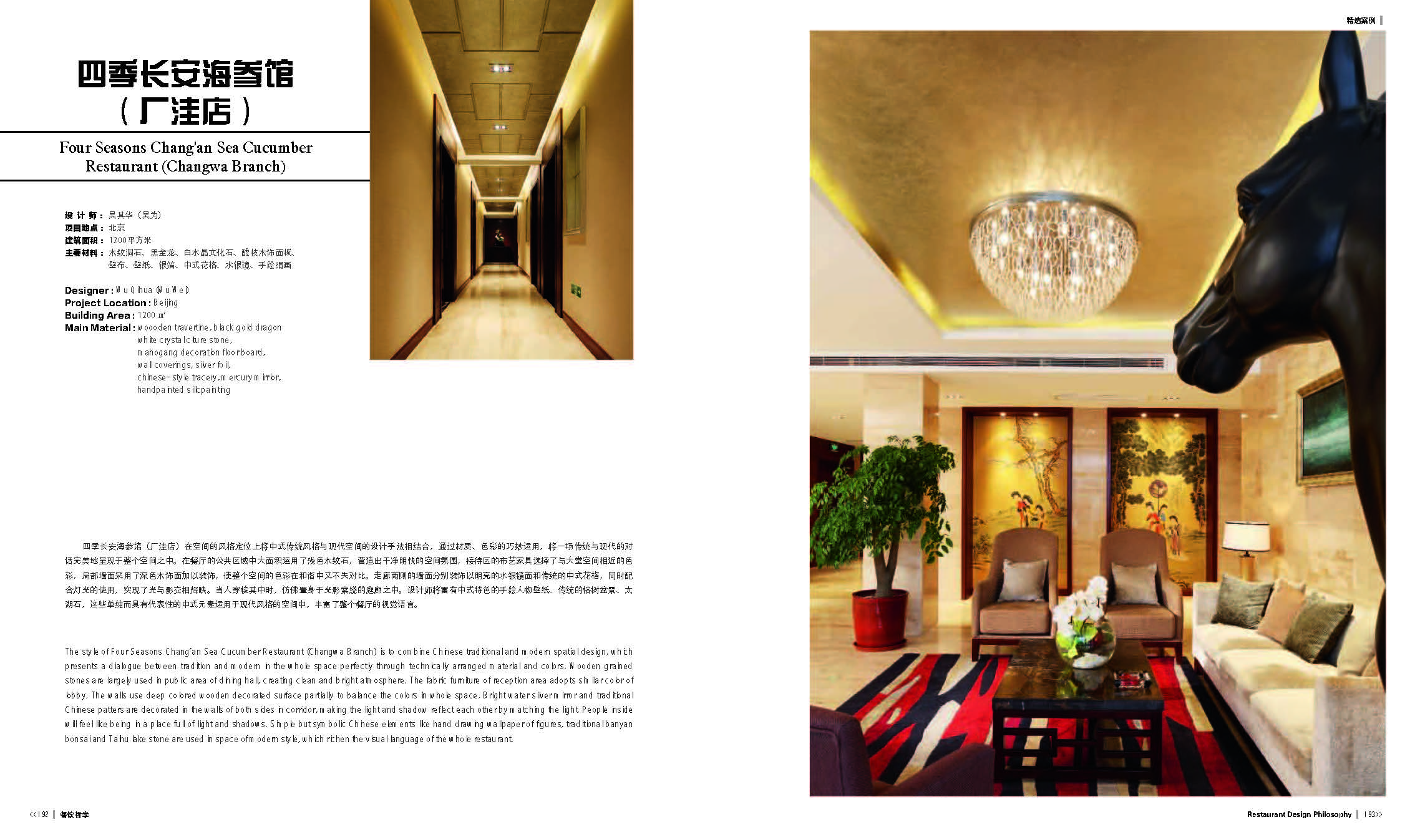 另一方面,出于信任,业主大多希望吴为在设计之初就能介入到他们的商业投资决策当中,将商业策略与设计策略融合在一起,由此,设计师所要承担的责任就大得多。吴为在设计之初就和业主一起讨论,根据经营的菜品、经营目标等来协助他们制定商业策略。在“四季民福”的案例中,业主在投资“四季民福”之前,也曾经营过几个餐厅,但都属常规方式。吴为的团队通过对“四季民福”所要经营的北京特色传统饮食烤鸭为主的新派中餐的考查,以及投资预算,辅助客户确定了相应的商业策略,并由此商业策略推导出满足投资回报所需的餐位数、成本控制等,最终形成一个明确的设计策略,在这个设计策略的指导下完成设计的主题、环境氛围、材料等的处理。正是通过这种设计策略的实施,才得以呈现出 “四季民福”现在这种现代与传统交融的设计风格,舒适、亲和的环境氛围。