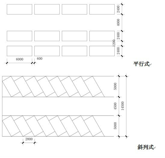 4.停车场的停车方式,根据地形条件以占地面积小、疏散方便、保证安全为原则,主要停车方式有平行式、斜列式、垂直式三种。其中间最小距离以小型车为例,停车方式见下图