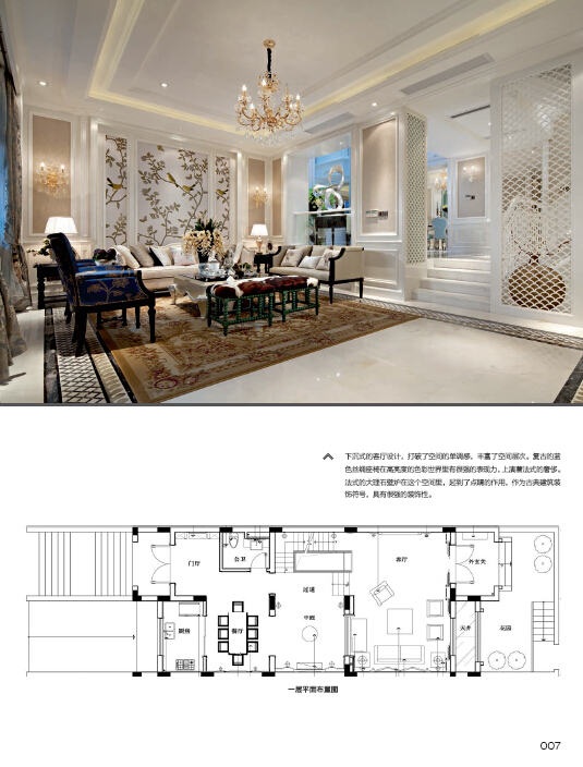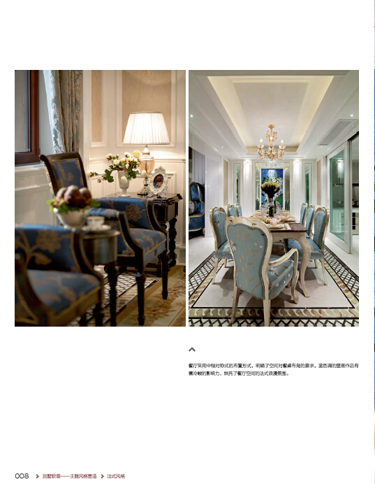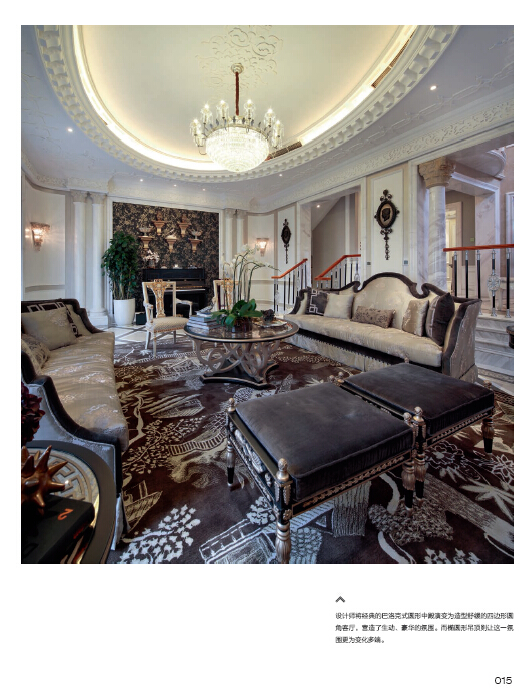 本书所枚举的案例中的每个功能区域都有相应的极为全面而周到的设计,从玄关、门厅、餐厅到卧室、娱乐室、酒窖等各场所既存有自身的独特属性,又相互有机关联,铸就和谐、统一的整体风格。设计师对家人关怀备至,通常为其预留出适当的表现空间,方便家人适时地添加生活中的趣味性元素。另外,别墅的使用性质在当下被提升到空前的高度,成为继业主主观意愿之外的影响软装设计的又一决定性因素。在绝大部分项目中,家具、配饰及陈设等已经变被动为主动,成为空间形象的掌控者与塑造者,并自动的组织空间、提升空间的服务质量和艺术感染力,形成新的设计理念,赋予室内空间个性化的文化内涵和风格特色。