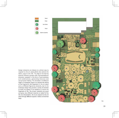本书内容主要分为两大部分,第一部分中玛莎施瓦茨与天津大学建筑学院风景园林系的联合设计以艺术为切入点,超越风格和形式语言的借鉴,训练一种开放式的,但又不失逻辑性的设计思维方式。而本书后半部分,内容上将第一部分所选取的艺术作品进行转译,最终形成景观设计方案。所要表述的概念必须通过作品的材料、特性、组合等能被观者直接感受到的东西来传达,让学生放弃惯用的从功能、流线和行为分析来切入设计的方式,而从一件与基地完全不相关的,但能打动内心的一件艺术品出发来开启设计。