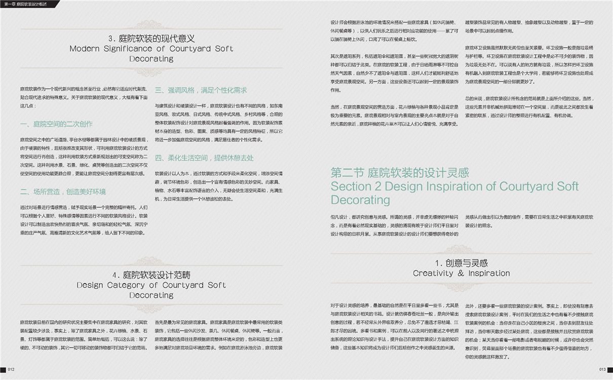 庭院软装目前在国内的研究状况主要集中在庭院家具的研究,对其软装配置较少涉及。该书从庭院设计角