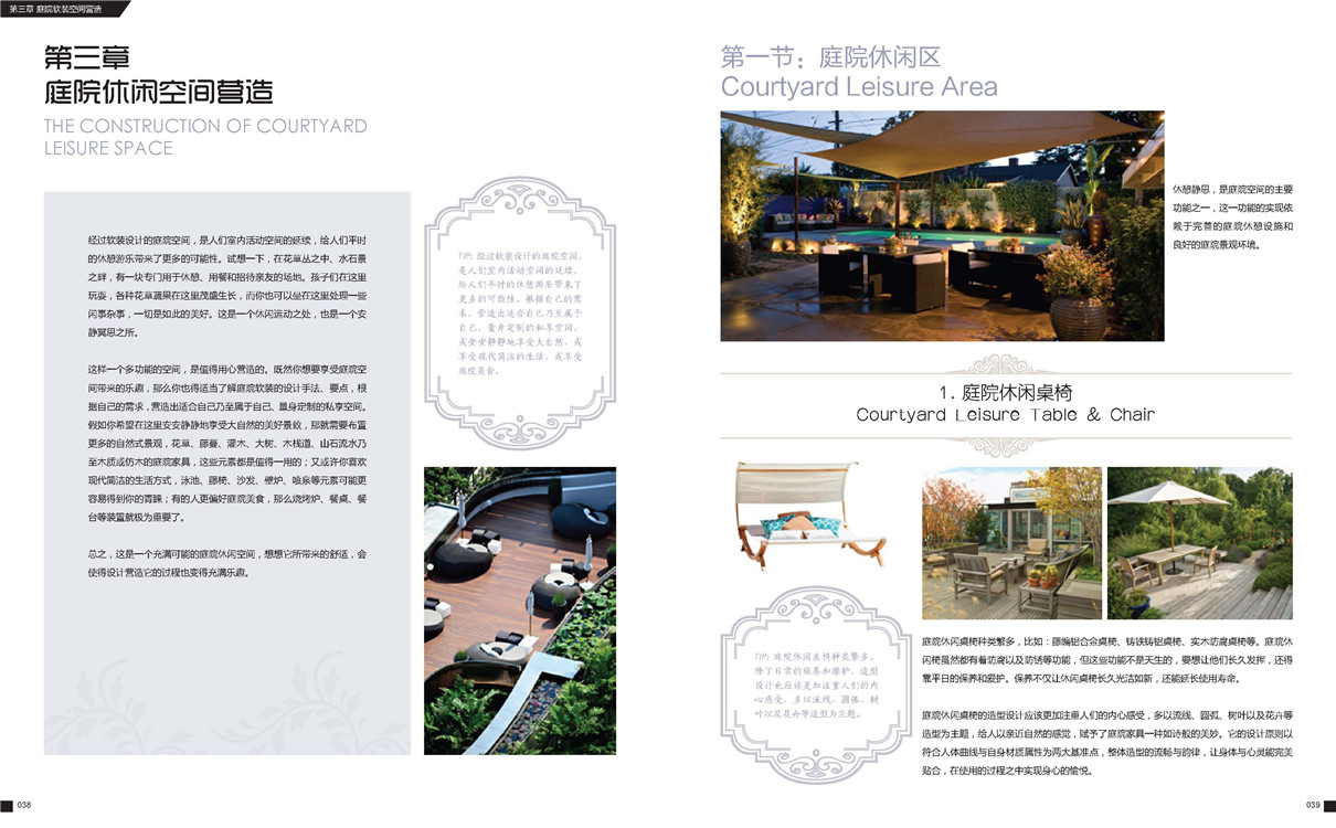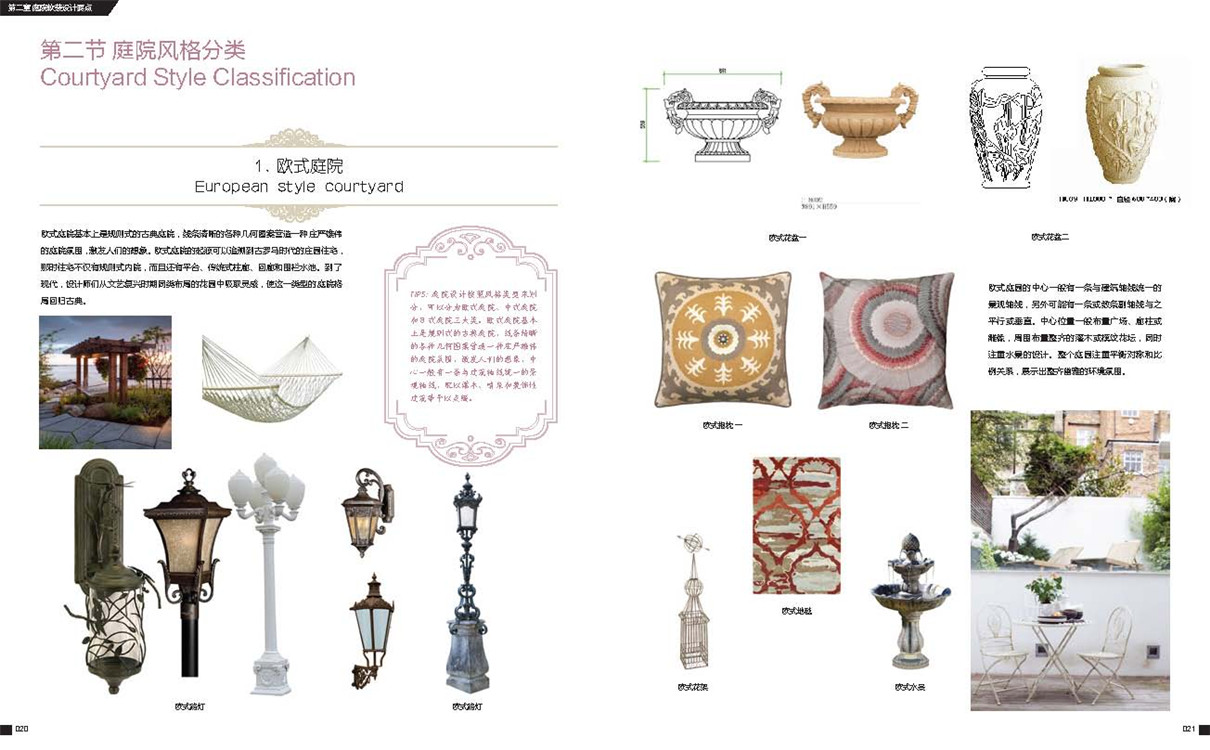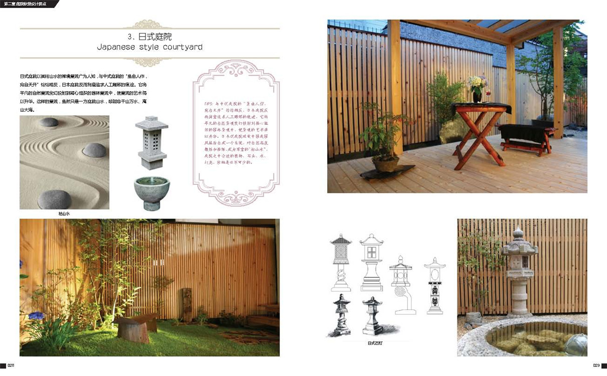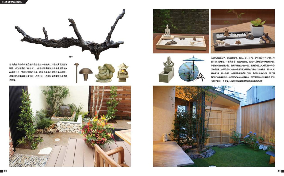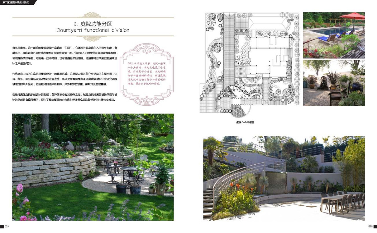 度入手着重介绍庭院软装的搭配和设计元素。从庭院家具、植物配置、庭院小品、铺装灯饰和不同庭院功能分区的软装设计要点等多方面,做了详细的介绍和说明。