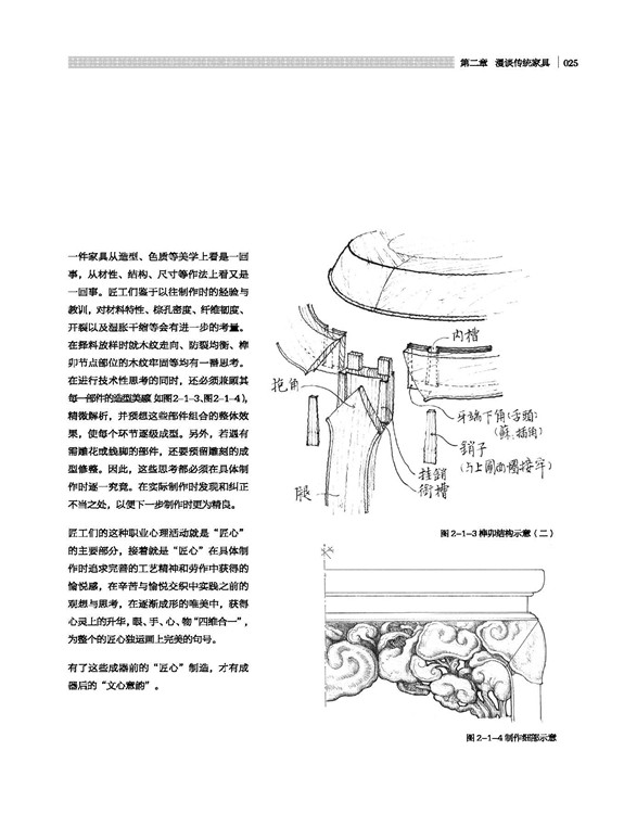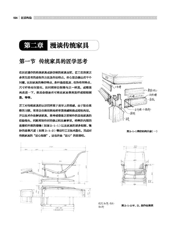 本书分为上下两册。文字卷与榫卯作法图例合为上册;中和圆通(家具构造要点)与制器设计作法图例等内容合为下册。本书文字卷为口述方式,讲述了现代木工应该具备的一些传统家具认知,有些内容重复提及,但都是在佐证其构造心法。文字卷中有些插图主要是配合文字内容的,不是作为家具产品推广,涉及的一些经典家具图片,均作了技术处理或转换成了黑白图片,或有不慎之处,敬请谅解。书中列举的家具编排序列不同于以往类似的使用功能排列,而是以家具结构作法特性来排列的,例如:束腰类的有凳、桌、椅、榻、床等,而四面平类的也有凳、桌、椅、柜、床等。这种编排方式主要是便于说明制器作法的构造共同点。榫卯作法略要图卷中的说明文字,以制图方式写在图中,但有些未尽意部分则另著写在图旁的空白处,需对照阅读,另外,在榫卯作法图旁有对应的透视草图。下册的中和圆通卷中,大部分是以传统经典器为例,另有一部分是笔者根据制式研究推演的创作家具。卷中未列入任何摄像图片,只有绘制作法图与透视图,意在从图中解析传统的构造原理与制作的一些注意要点。原图稿中的毛笔字是多年前书写的,有较多错字或漏字,但大致上是符合拙者意思的。本书是基于公共认知上的传统家具来叙述的,对现有传统家具的公共信息进行归纳和梳理,从中寻找出一些普遍的规律及作法规则,不针对明式或清式,也不涉及专门的黄花梨、紫檀或宫廷家具以及硬木软大漆家具等人文专业,也没有学术性的历据或论证等。只是匠工以构造技术视角的一些思考,故名匠说构造。