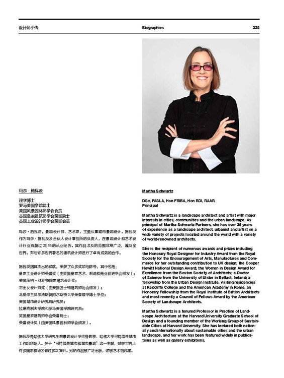 本书主要展示了美国景观设计大师玛莎·施瓦茨从业以来,在世界各地极具影响力的代表作品,是一部集大成的景观综合艺术宝典,其作品注重都市场所和城市中心的激活和再生。作为国际知名设计大师,玛莎·施瓦茨和她的团队已拥有30 多年的设计经验,运用景观、艺术和都市理念,打造众多小品装置、花园、公共广场、公园、机构景观、公司总部、总体规划和城市再生景观。其作品涉及城市生活的方方面面,注重营造可持续发展的城市景观和公共空间,为城市生活提供了良好的平台。