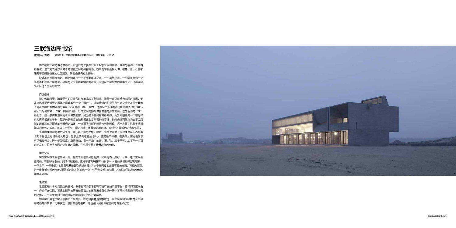 本书是当代中国建筑界的一线大师作品选集,收录三十余位当代建筑师2013-2016近四年的代表作品,在某种意义上是几年前中国建筑作品年鉴的后续与综合。其中书里收录的每座建筑成果,包含详尽的平立剖图和细部图,高清照片和设计说明,综合体现了当代建筑的核心内涵、空间品质、建造逻辑与场所感。这些作品呈现出当代中国建筑具有国际视野,地域内涵与精致性等特征,在某种意义上,本书定位为反映当代中国建筑师作品的高水平、所处时代的缩影以及对当代国际思潮的回应。其中所选作品类型十分广泛,从运用新技术的诸如服务中心的建造,到历史街区和老建筑的改造,从博物馆、图书馆、美术馆、剧院等文化场所的设计,到对乡村和未开发地区的关注。所选作品提供了当代中国建筑创作的多元形式。