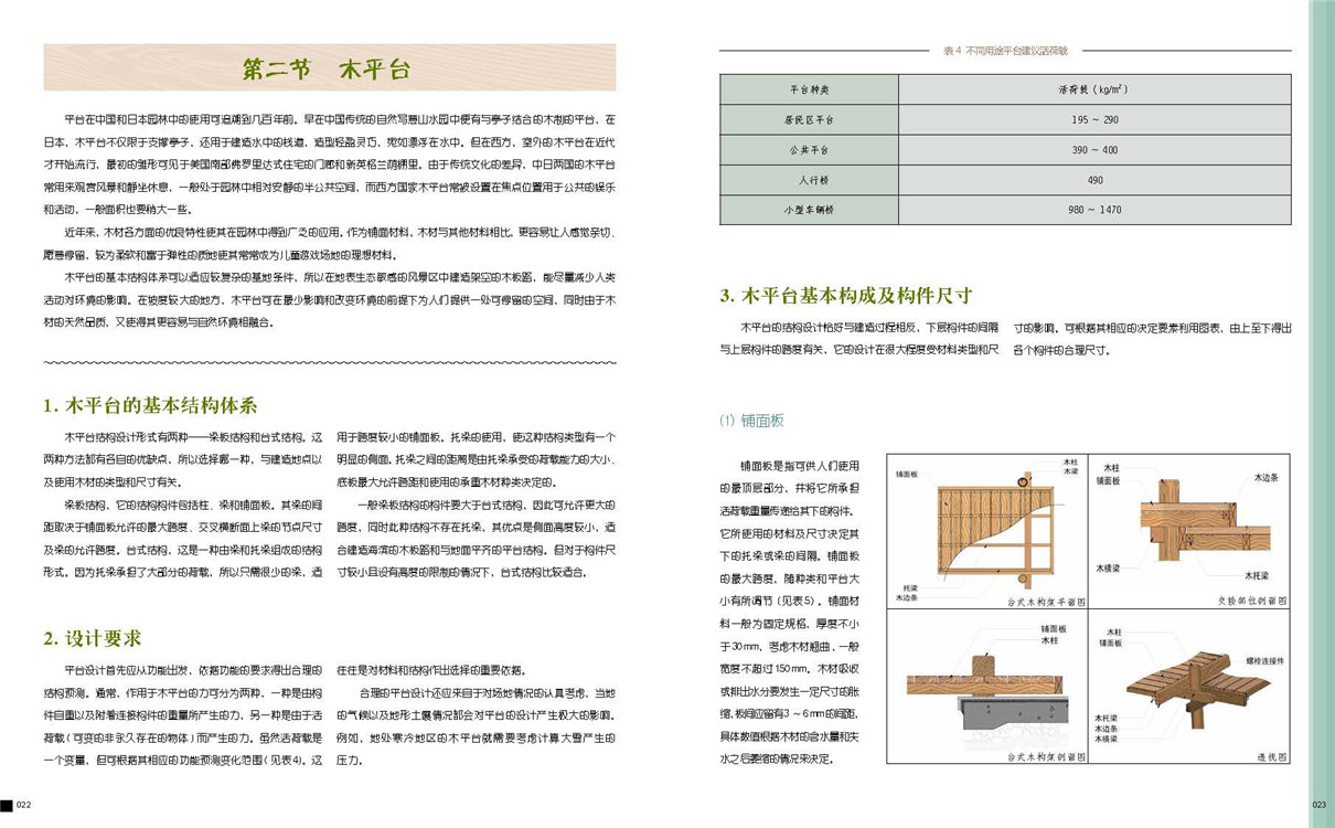 2. 对木质平台、廊架、桥梁、户外家具等景观设施的施工细节解说。