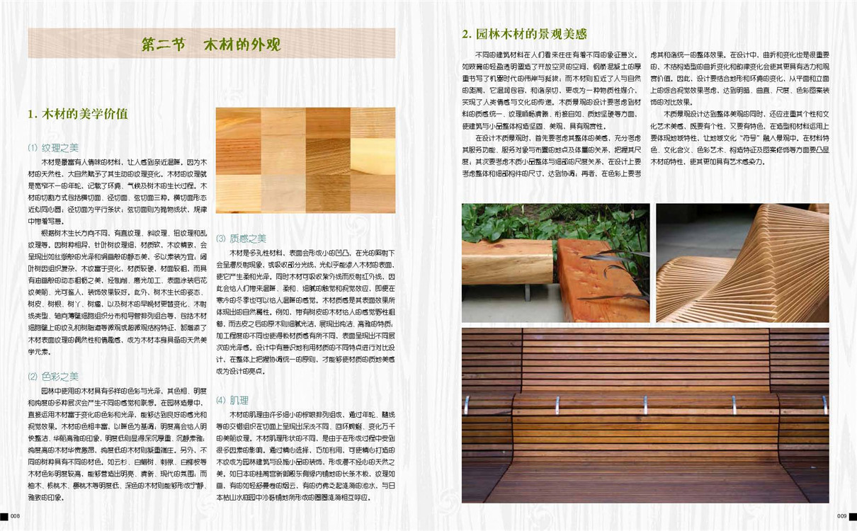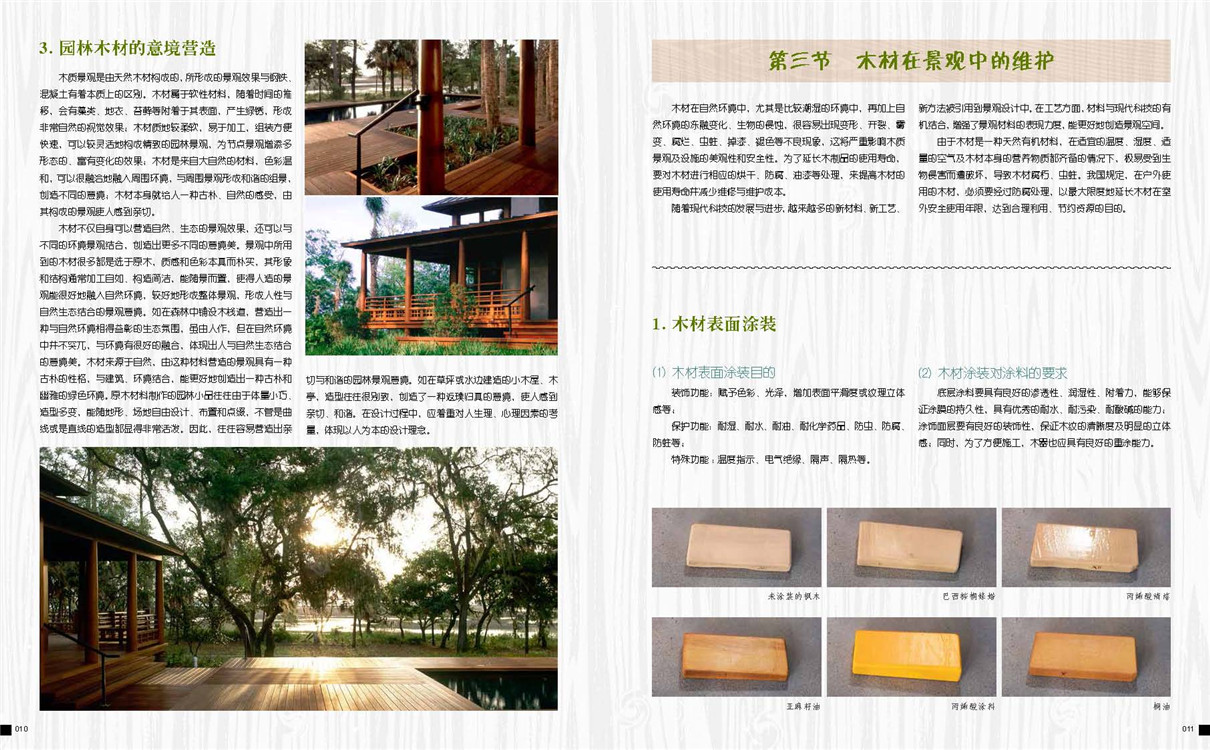 目前,木材应用于景观设计正处在一个新旧材料、新旧技术交替时期,不久的将来,在充分保护环境和遵守有关国家规定的前提下,从生态、资源可持续发展的角度积极、合理地开发利用木材资源,相信专用室外才材及其景观制品将得到更广泛的应用及大家的认可。本书的亮点在于: