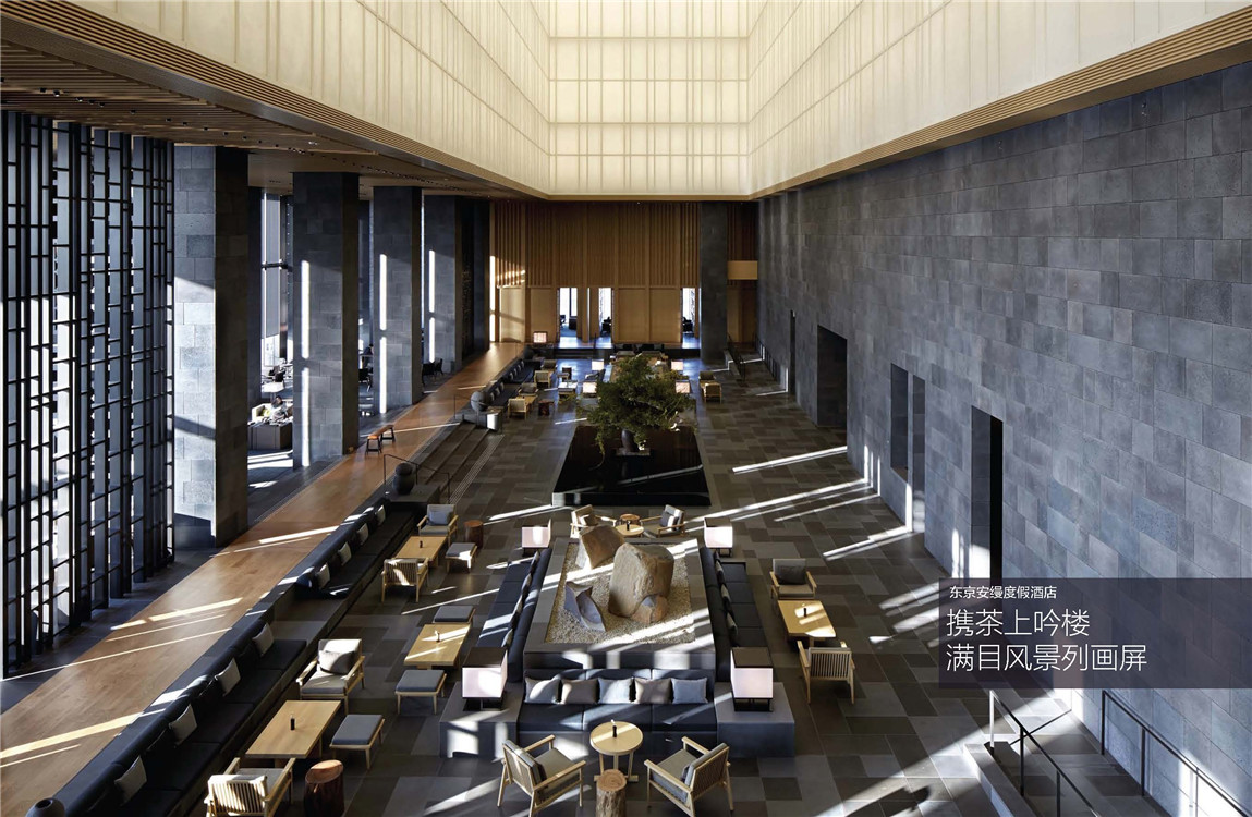 东京安缦酒店是以建筑室内设计与当地建筑文化的和谐统一为设计思路,通过一系列独特的构成元素,将传统和韵完美地融入现代风潮中,巧妙地展示自身特色。大量的光线搭配经典日式材料,如樟木、和纸及山石的运用,融入现代科技,通过各种各样的织品和材质形成令人不可思议的明暗互动——成为此空间设计和氛围营造的关键。木、纸、山石自然材料的运用,唤起了人们对朴实自然的追求,并营造了“简素、自然”的禅宗意境。