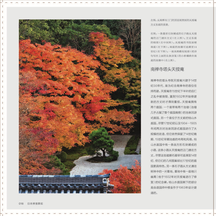 本书配合英国花园摄影师Alex Ramsay的精美图片,介绍了日本禅宗庭园的发展历史。作者试图通过追寻这段历史,来展现不同文化跨越时空的融合,包括古代与现代,本土与外来。内容上主要讲述了如何催生出多元化的日本庭园设计传统,并且如何将其影响力扩展到佛教寺院的范围之外,以及禅宗庭园中的景观设计手法。此外,另有一章专门探讨禅境景观与日本茶庭的关系,并介绍庭园中具有重要价值的树木与灌木等细节设计。