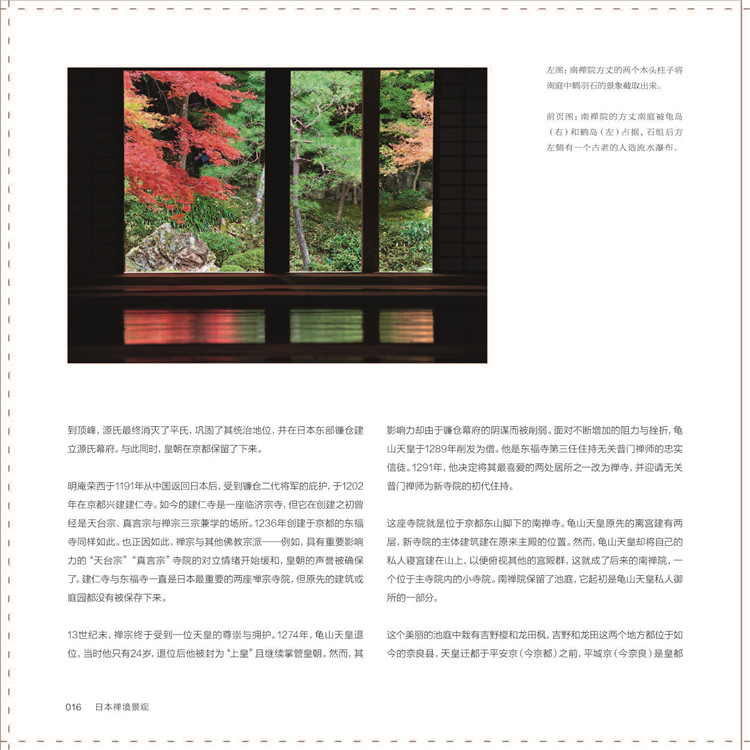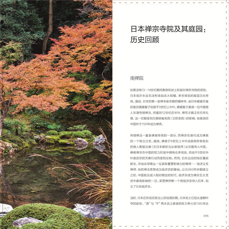 禅宗寺院对日本庭园艺术的发展起到了重要作用。它们为之提供文化土壤,使中国文化得以对日本庭园传统产生新的影响。日本禅僧对中国传统文化,尤其是书法和水墨画表现出浓厚的兴趣,同时中国山水画的空间处理及透视法也对日本庭园设计产生了深刻的影响。为了使读者对日本庭园有一个比较全面的认识,本书力图使读者在了解日本庭园的同时,既可以了解日本的禅宗庭园文化和历史,以及现在和未来这种禅境手法的应用,同时本书能为当代的景观与环境设计提供些许借鉴与参考。
