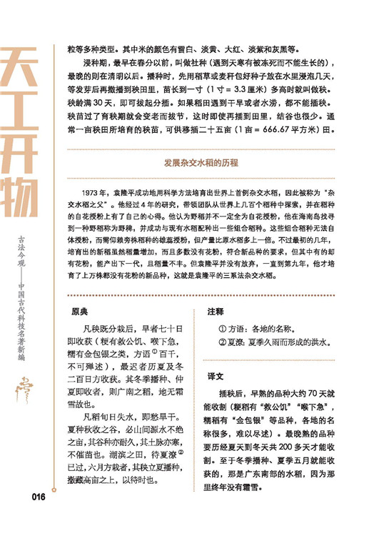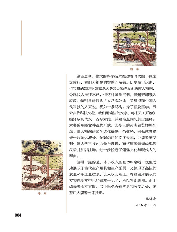 本书采用图文并茂的形式,为今天的读者阅览辉煌灿烂、博大精深的国学文化提供一条捷径,引领读者走进一片源远流长、光辉灿烂的文化天地,让读者感受到中国古代科技的力量与理趣,而将原著编译成了现代汉语并加以注释,进一步拉近了遥远文化与现代人的距离。值得一提的是,本书收入图画200 余幅,既生动地展示了古代生产用具和生产场景,又体现了高超的农业和手工业技术,让人叹为观止。有些图片,展示的实物在现实中已经很难一见了,所以特别珍贵。