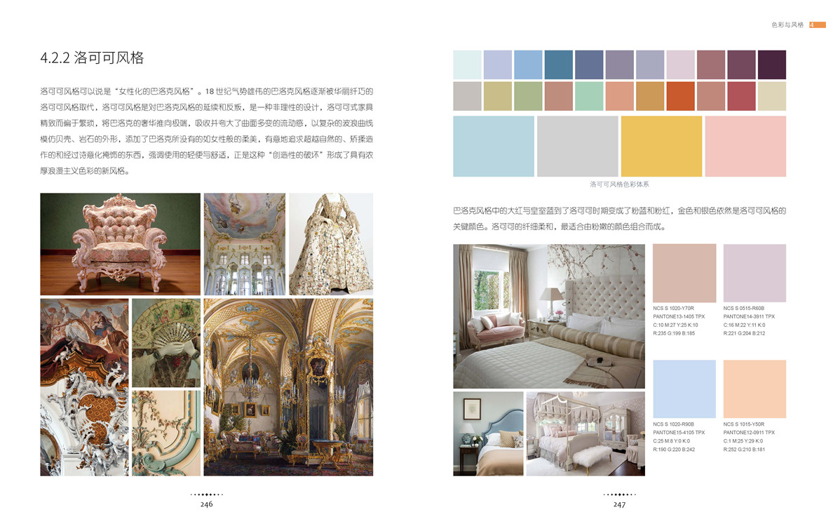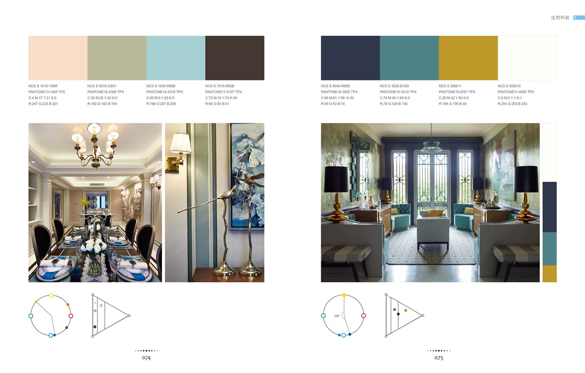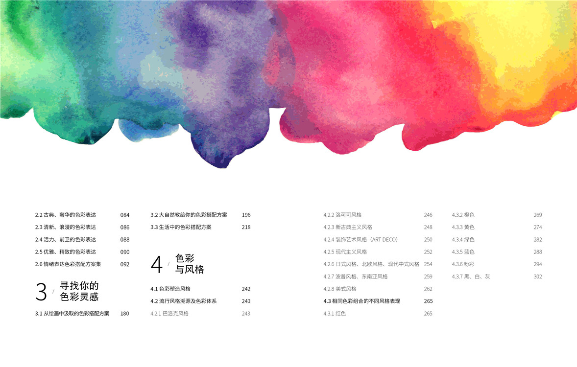 第四章则为读者揭示纷繁复杂的风格本质,总结风格的色彩特征,同时也让读者看到,同样的色彩组合能够表达不同的室内风格。在室内环境中,通过色彩组合所营造出的氛围,基本上就已经能够确定风格的基调。而对时下流行“风格”的认知偏差,往往成为设计师与业主之间沟通的障碍。本章对当下流行的风格做概括性的溯源,总结各种风格的典型色彩搭配特征,便于读者在实践时更灵活地操作。