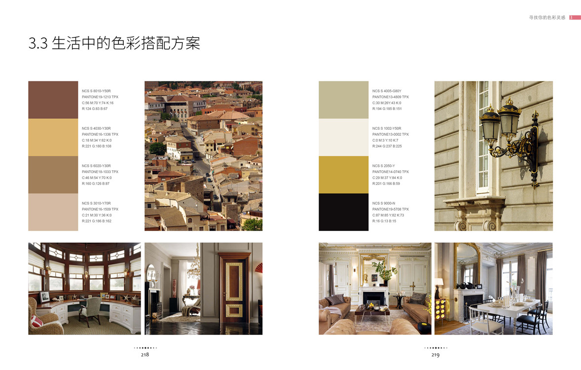 配色方案与实景案例无缝结合。本书为读者呈现了大量的室内色彩组合方案,且每组配色方案都搭配了实景案例与NCS色号、潘通色号、CMYK和RGB色值,既可以作为设计师的色彩搭配参考又可以作为设计师与客户沟通的桥梁,让色彩组合不再只是人们眼中抽象的色块。