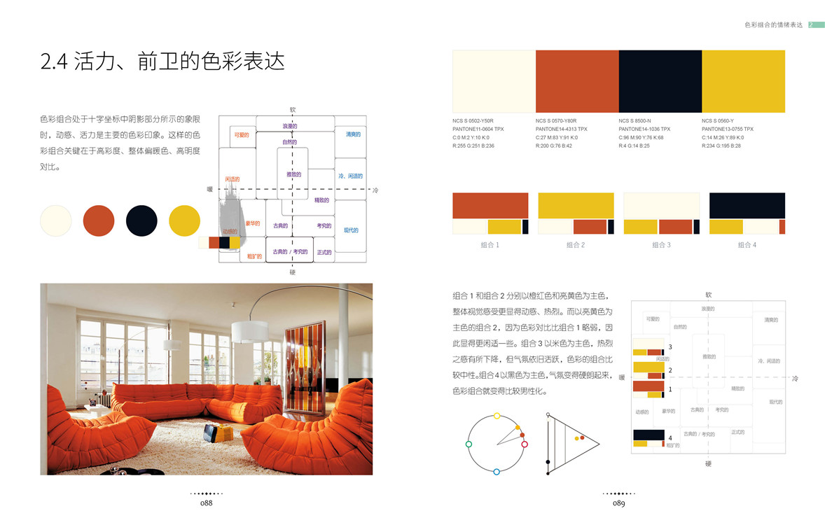 第二章通过量表,将抽象的情感感受落实到具体的色彩组合之中,色彩是衡量人的喜好和情感的标尺。然而,人们对色彩的喜好往往与某种社会因素或个性因素有关,在实际的设计中,某一种颜色永远不可能孤立存在;