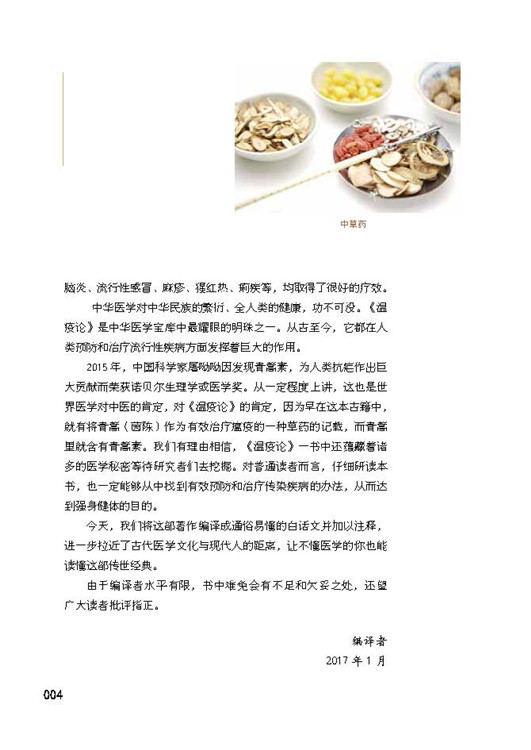 本书译者采用图文并茂的形式,根据书中内容,结合注释,汇集大量药草图片,方便了今天的医学研究者对外感热病的研究,是中医药研究者、学习者和中医爱好者的重要读物。