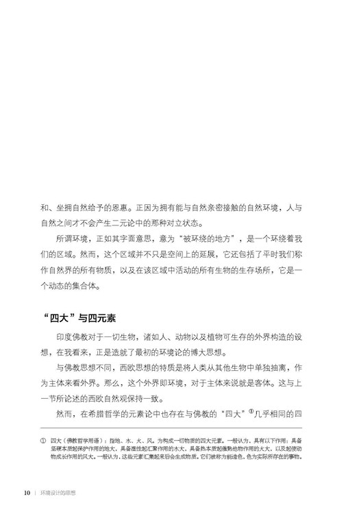 “Nature”还包含“人的天性”这层意思。指人与生俱来的性格,即天性、本性、脾气等意。作为物的自然与作为事的自然,虽是两个含义,却相互重叠,具有双重性,表示人一方面具有物质肉体层面的实在感,另一方面则具有精神层面的存在感。这对我们阐明环境或环境设计而言,也许将会是一个超乎想象的重要契机当我们追问自然的反义词时,通常脑海中会浮现“人工”一词。这是因为将自然与人工相对比,从中也可清晰看出西欧二元论所强调的对立。