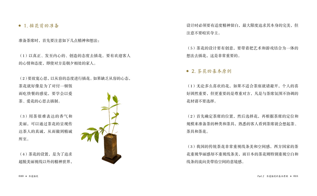 即使茶席插花学起来不太容易,但是站在学习茶、爱茶的立场上,不能冷眼看待的就是茶花。不谈茶花就不能论茶席,凄凉的茶席上不可能有像样的茶,这样的茶席上能容纳茶的精神和茶道的空间是相当狭窄的,这也是我们编写此书的初衷之一。就如同为了当一个好的画家,首先要懂得欣赏作品一样,当读者们翻看此书时,能培养季节、茶和花的协调感,并逐渐领悟出“茶道”的精神,那将是我们莫大的安慰。