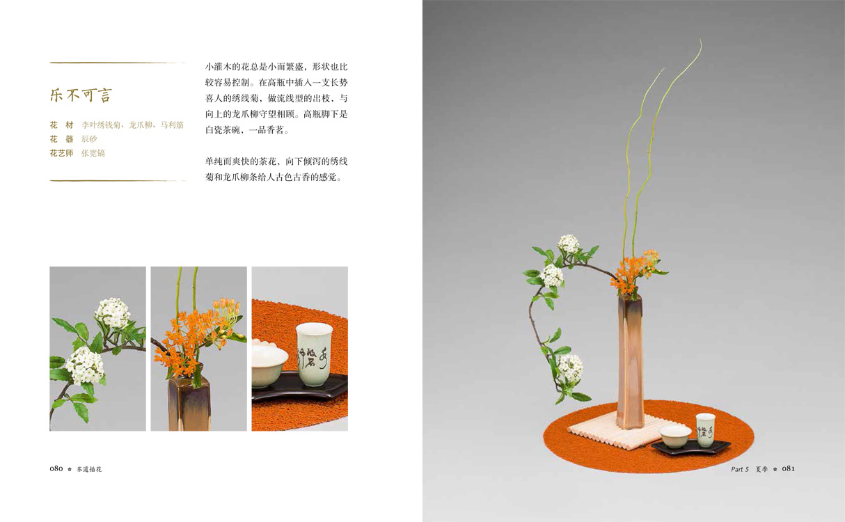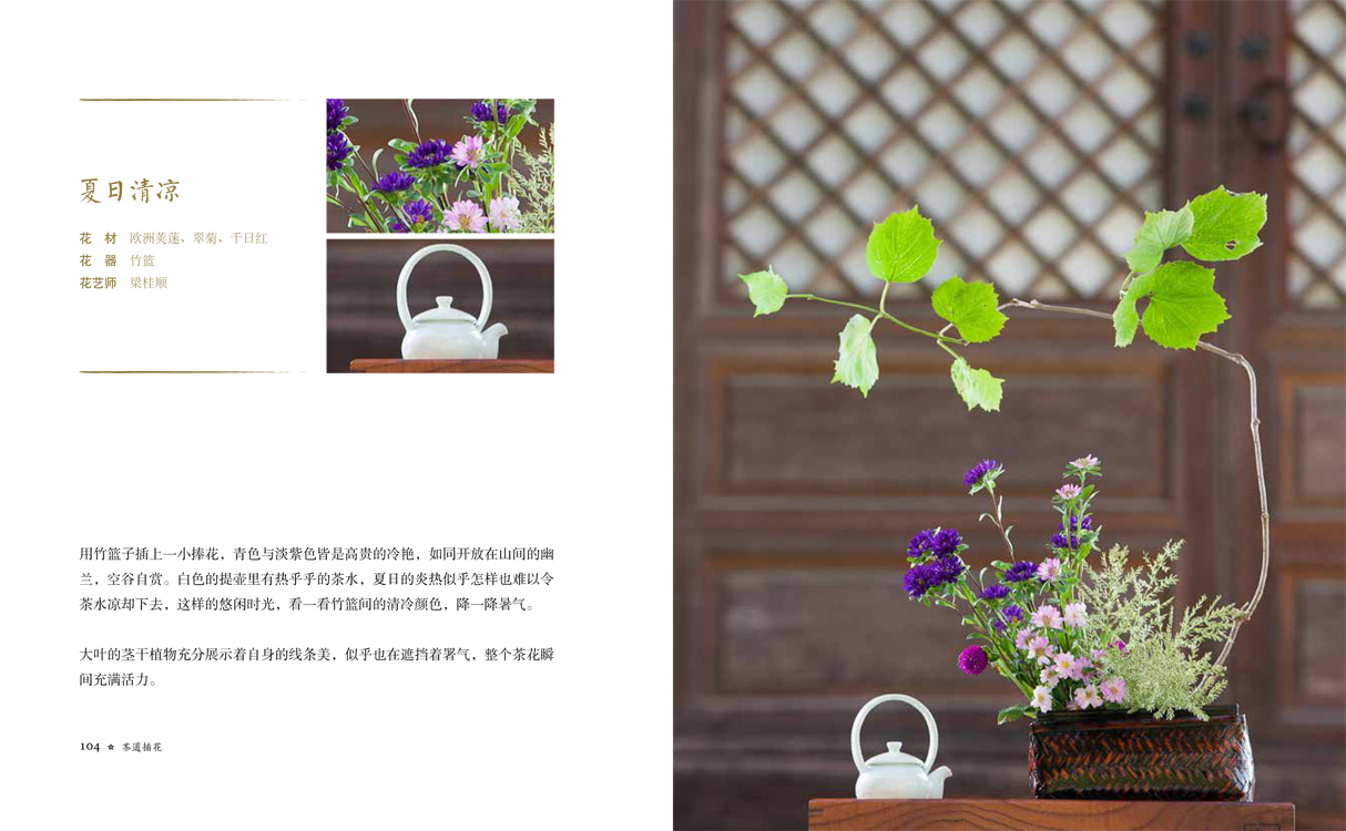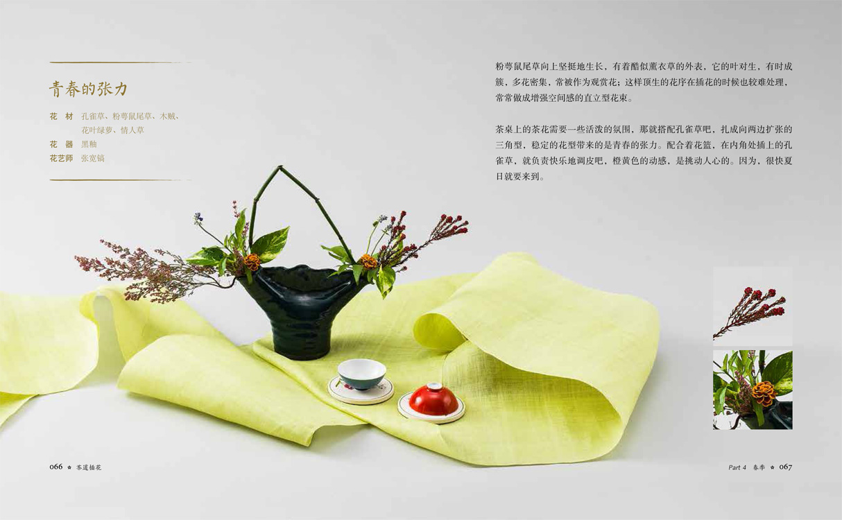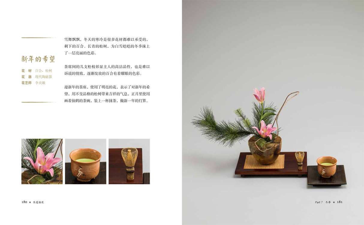 全书的内容含括茶花的特点和美学特征、茶道插花的基本原则、花材和花器的选择等,并根据春、夏、秋、冬四个季节进行划分,收录了100多个茶席插花的作品,每个作品里面含括花材、花器以及设计特点等文字,方便读者在进行茶室装点、品尝茶水的同时,选择合适的器具,并由此美化我们的生活空间,提升大众的艺术品位。