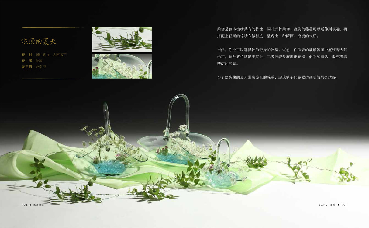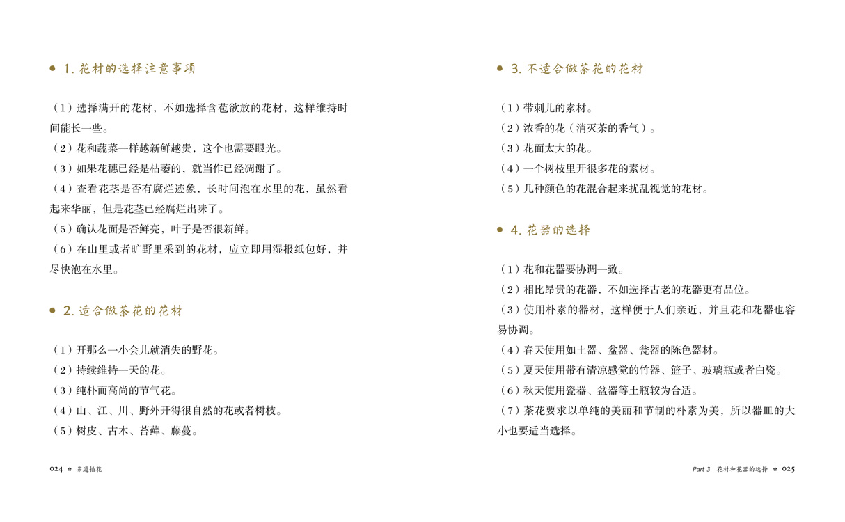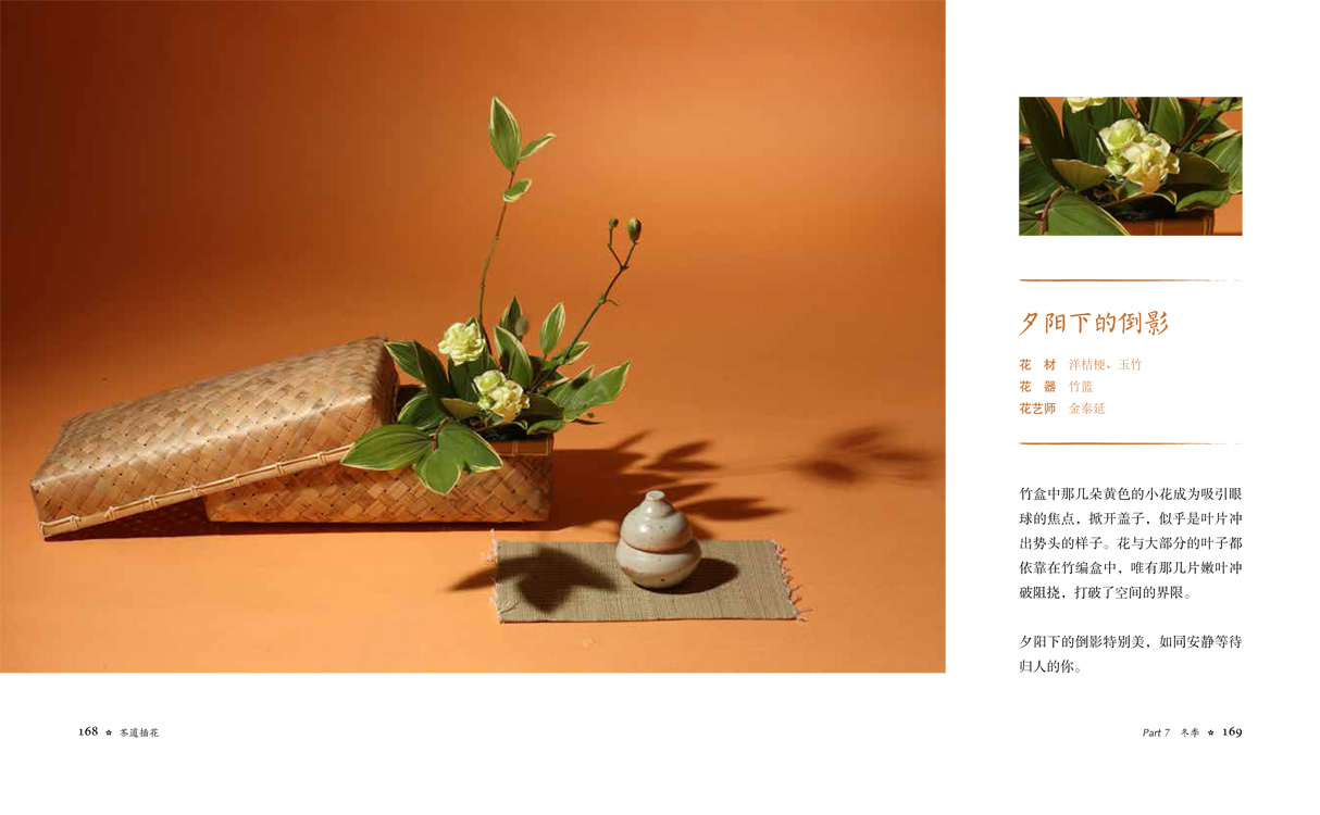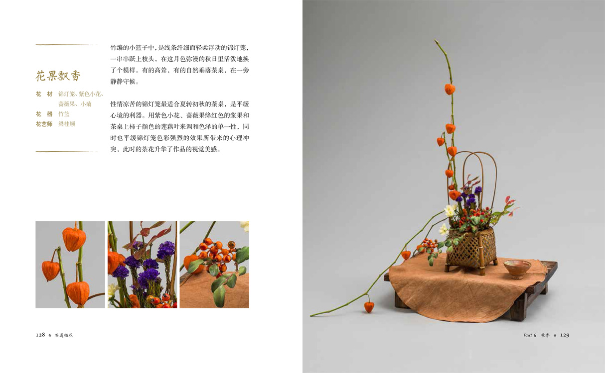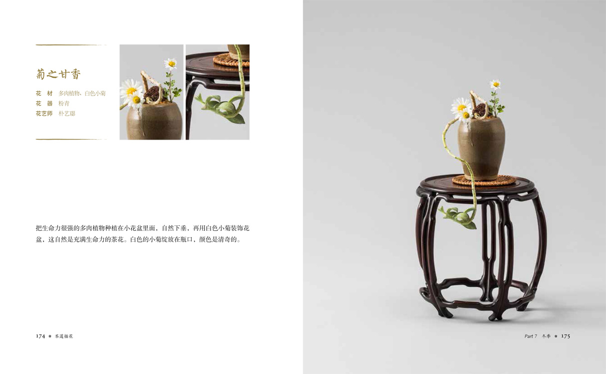 全书的内容含括茶花的特点和美学特征、茶道插花的基本原则、花材和花器的选择等,并根据春、夏、秋、冬四个季节进行划分,收录了100多个茶席插花的作品,每个作品里面含括花材、花器以及设计特点等文字,方便读者在进行茶室装点、品尝茶水的同时,选择合适的器具,并由此美化我们的生活空间,提升大众的艺术品位。