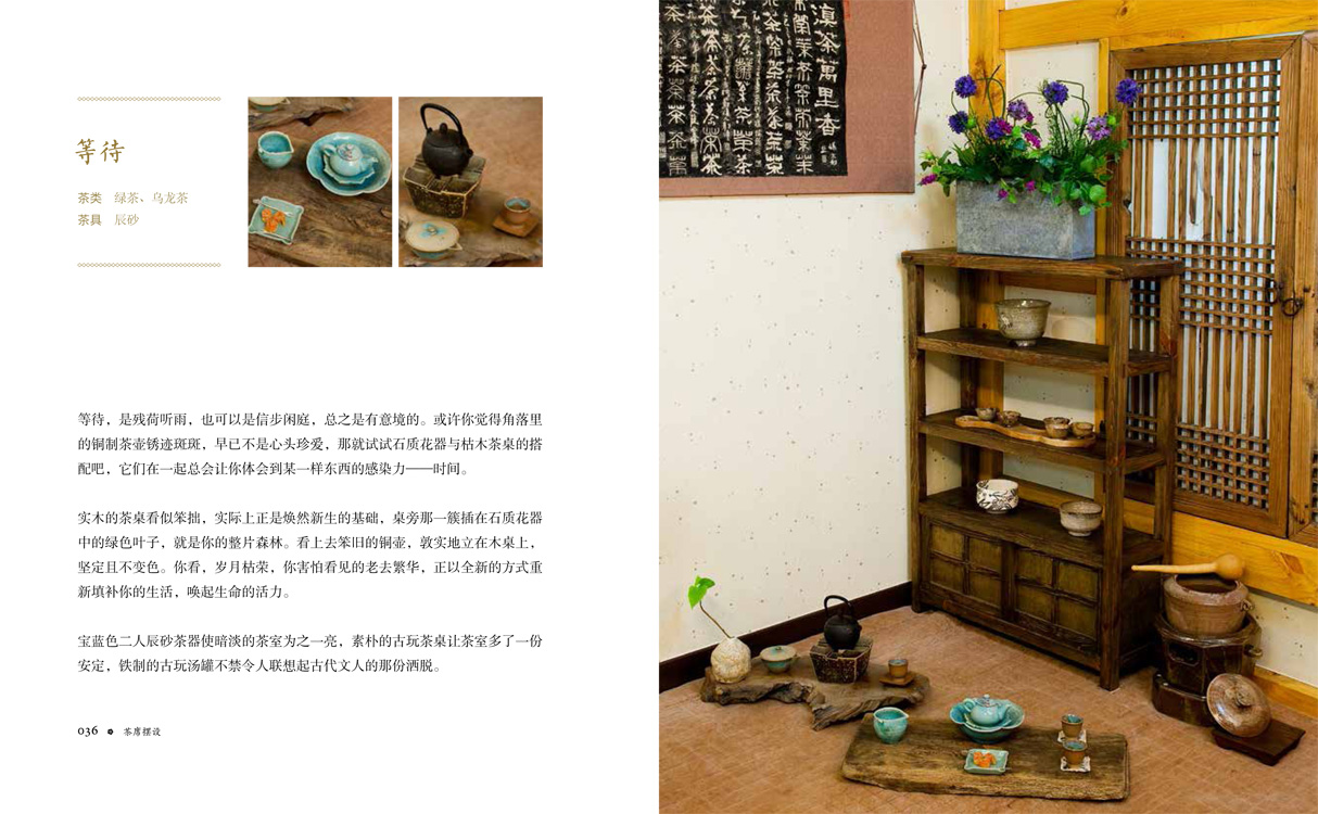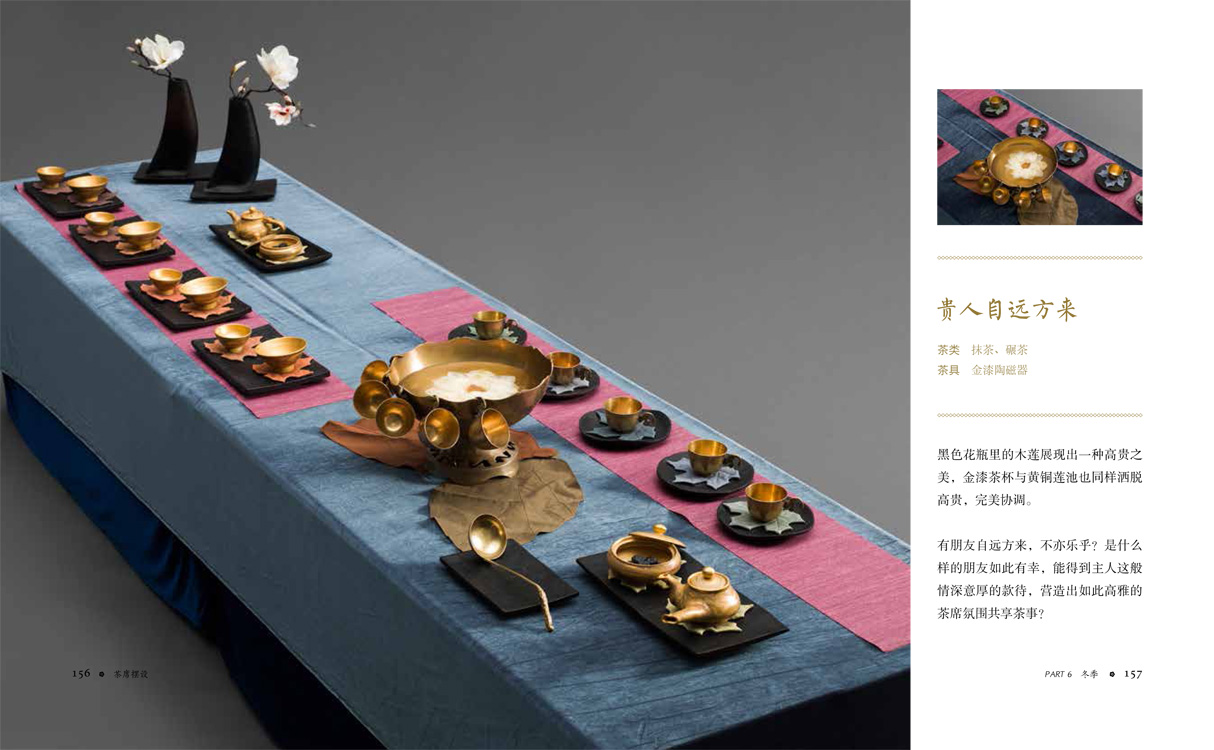 在这本传播传统文化的作品面前,我们一度为书中华美而有格调的茶席设计叹为观止。除了可以欣赏到绿茶、红茶、青茶、花茶和普洱茶等各种精心摆设好的茶席之作外,还能欣赏到雅致的茶室、桌越的器物和丰富的茶艺。遵循传统,但不停止追求全新的尝试,希望此书能给世界浸染一抹茶香,这是我们追求的目标。如果能因此让世界多一点美好,这将是编辑的荣幸。