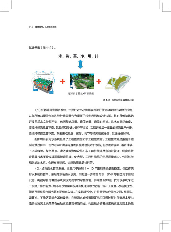 第二部分为规划,针对海绵城市的规划编制总体概况以及相关规划要点进行了详细的分析,从海绵空间格局、低影响开发雨水系统构建、专项规划衔接、总体建设任务、近期建设详细规划和指导手册等多个层面,结合相关规划实例做了系统的解读。