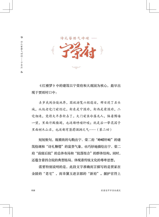 本书提炼出经典文学作品《红楼梦》中的园林、建筑部分加以描述,内容依据主要人物的住所院落划分,重点围绕大观园的园林布局、荣宁两府内主要院落建筑展开描写,涉及怡红院、潇湘馆、蘅芜苑等主要人物的居住活动场所,作者谈古论今,旁征博引,淋漓尽致地描绘出古典园林建筑的艺术感。本书将园林和建筑之间的关系做了清晰的分析说明,在对《红楼梦》这本书中的园林建筑进行描写的同时,结合我国现存的古典园林建筑,从多个角度分析他们的差异和共性,并结合时代特点,引申到现代的园林建筑设计上来,一方面帮助设计师领会中国古典园林建筑的工艺美,体会古人的智慧和高超技艺,另一方面给红学爱好者打开了另外一个角度来研读《红楼梦》,即使是普通的大众读者,读来也会获益匪浅。