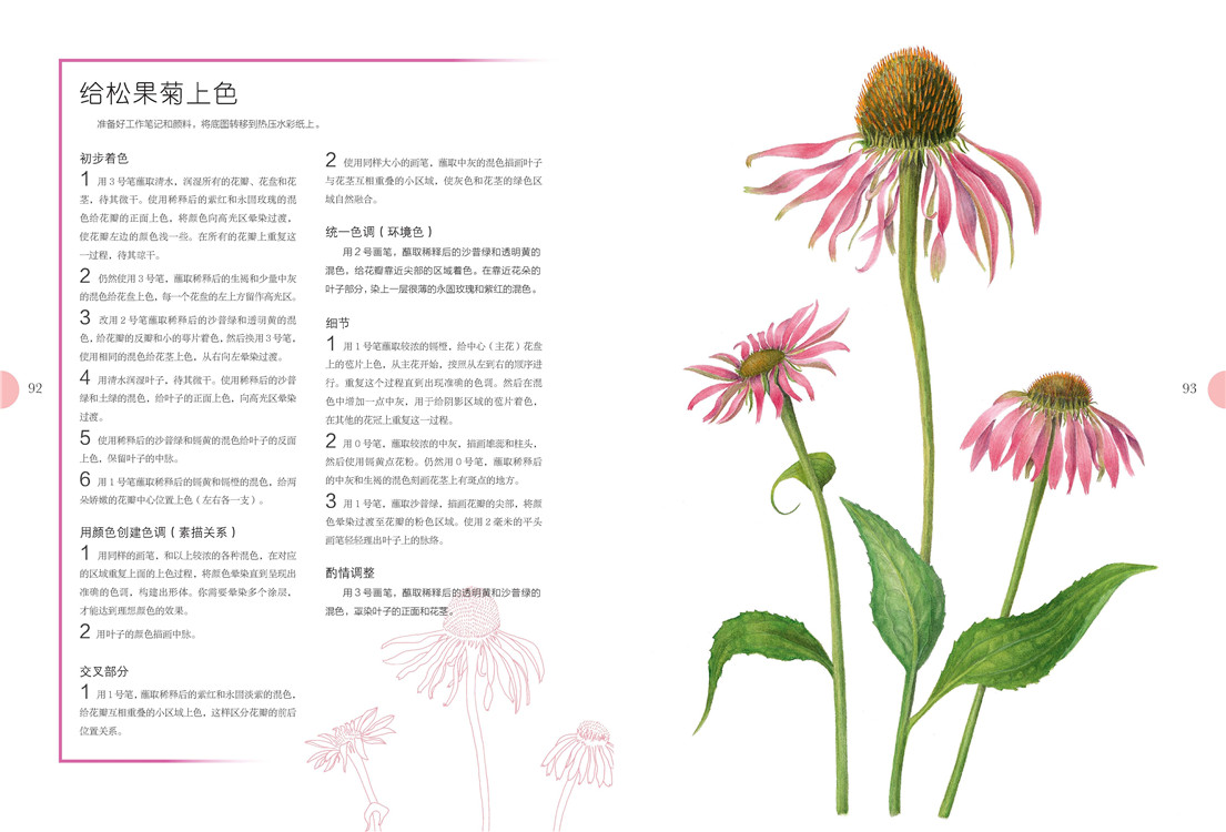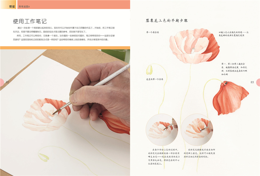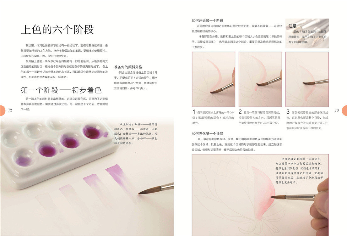 必备的画前准备后,是艺术家对造型和设色的讲解,扫除你的入门疑虑。之后出场的是有充分详解步骤的绘画案例,玫瑰、马蹄莲、鸢尾……你肯定会喜欢。充分的练习后,需要反思总结,艺术家在这里列出上色的六个阶段,这有助于你更精准地使用颜料,帮你走向真正的植物绘画。