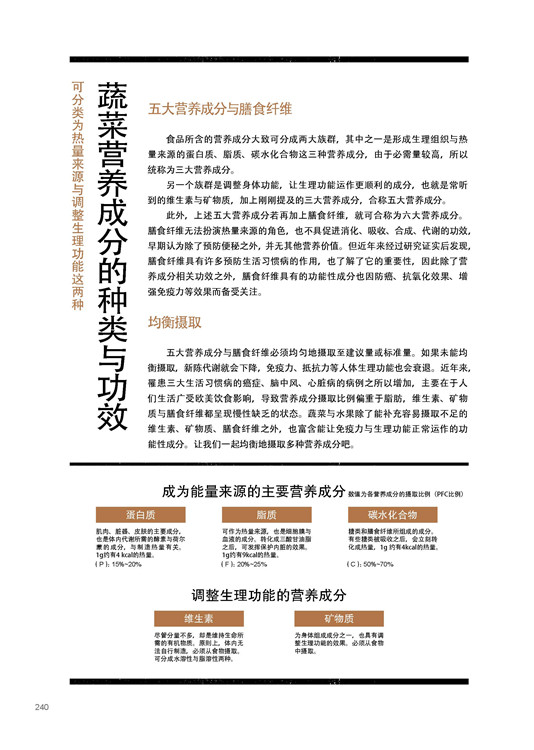 书中最后一章还详细介绍了蔬菜的基本营养成分如蛋白质、膳食纤维、碳水化合物、维生素等的功效,并列举了富含这些营养成分的蔬果与食品,指导读者在身体出现特殊症状如贫血、高血压、