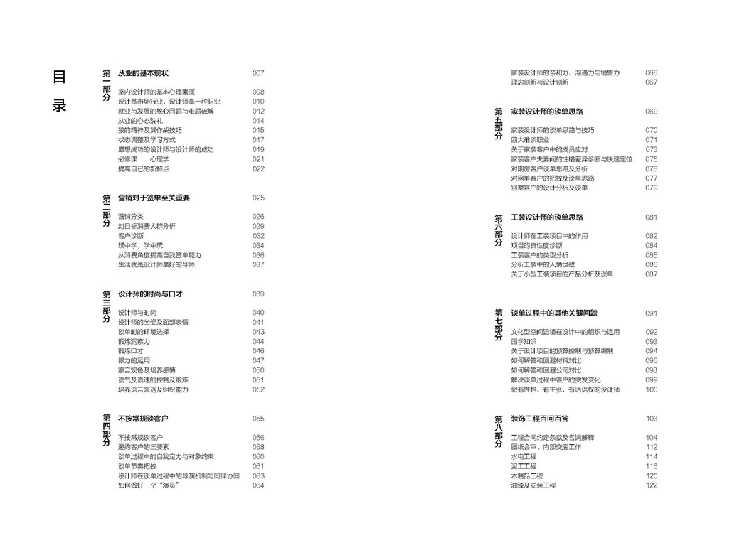 儿应聘到一家企业,从打扫卫生开始,靠着自己的努力和勤奋爬到了CEO 的位置,到达她职业生涯的顶峰。我们可以把眼光放得长远一点,让自己的视野开阔一些。假想一下,如果忽略你所服务的小公司的概念,把中国室内设计想象成一个大公司,你是中国室内设计这个大公司的一个职员。既然你在一个公司供职,那就要不断努力地寻找晋升机会,你就一定会成为设计总监或者CEO,最后让自己达到引领整个室内设计行业的高度。所以你见的每一个客户、谈的每一个单子,都是你的职业晋升的资本,都必须认真对待。即使这单费了九牛二虎之力最终没谈成,也要面带微笑地欢送这个客户。这不光是工作的历练,更是好人品的累积。我们来做一个简单的加法:你在这家公司的第一年签了有20 家客户,第二年去别家公司或者还在这家公司又签了20 家客户,那么加上之前的就有40 家客户,如果干了5 年,那就有100 个客户,在这100 个客户中就已经有了小小的名气。如果这100 个客户的亲戚朋友装修时也能想到你,那么在室内设计这个市场的群体里面,你就必然占有了一定的份额。