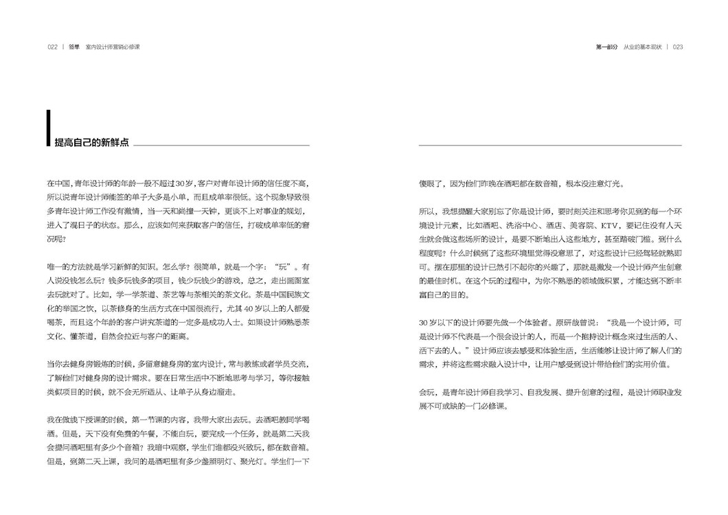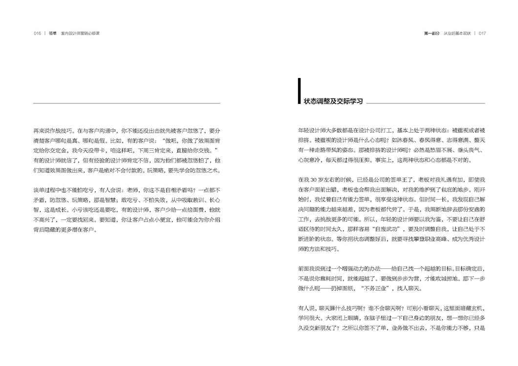 有缘看到这本书的人必定是刚入行的设计师或者已经从业很多年了,但是,我想问大家一句,你们是不是真的搞明白了自己的职业定位?我以前接触的很多在设计公司里工作的设计师,他们无一例外地认为自己是给老板打工的打工者,最多是个高级打工者。在这里,我可以很负责任地告诉大家,这种想法是大错特错的。为什么会这么说?因为你做过的每一个单子都是在为自己打工,而不是为任何人做嫁衣。大家有没有看过电视剧《杜拉拉升职记》?一个什么都不懂的女孩