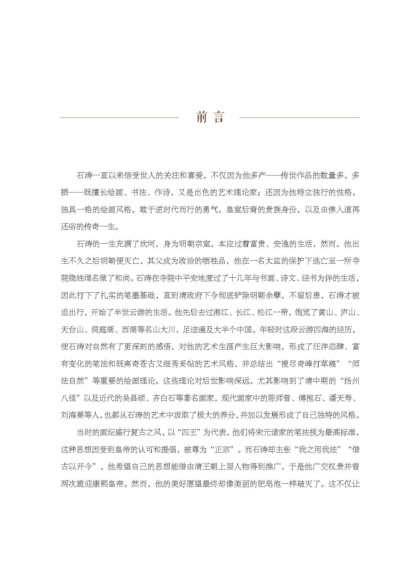 为了使读者更全面地了解石涛的绘画理论,本书在每个篇章之后附短文一篇作为拓展阅读,内容涉及石涛的人生经历、艺术生涯、生平趣事及其画论、画作,以及他在其他艺术领域取得的成就等,全方位地为读者介绍了这位画坛巨匠。