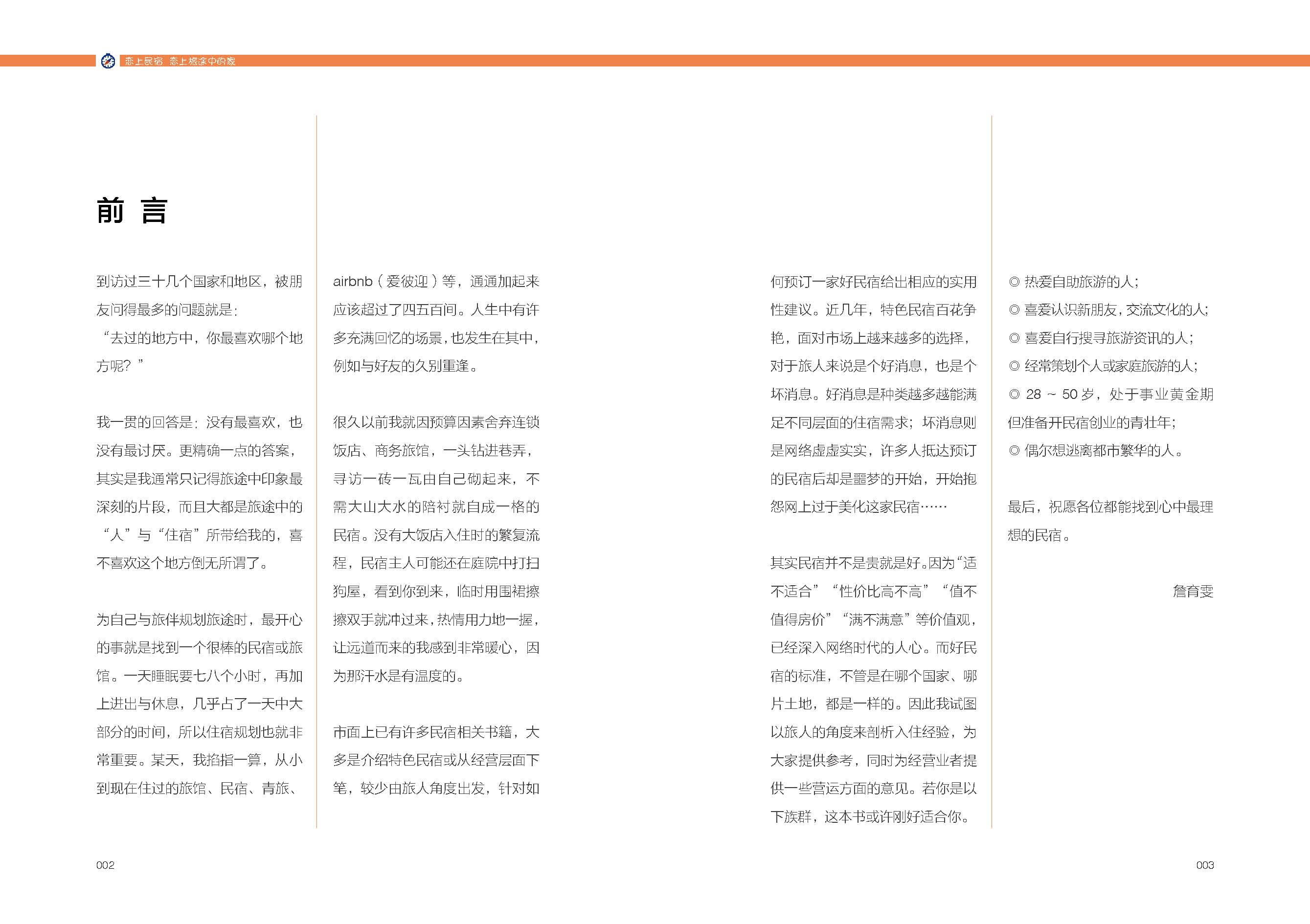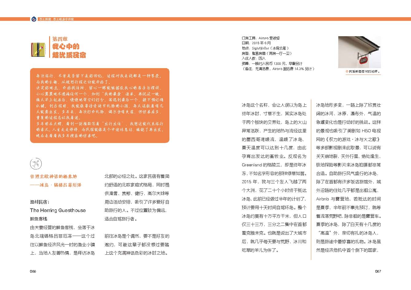 和詹育雯相识,源于她的第一本书《民宿网Airbnb,带你住进全世界人的家》,我引进并责编了这本书的简体版。后来她来北京玩,我们约好地方见了面,看着她瘦瘦弱弱的身形,很难想象,这个女孩子,已经走遍了世界上四十多个国家。我想她一定是从事着非常挣钱的金领职业,或者父母出资,才能这么潇洒的周游世界,然而交谈下来发现,并不是。她就是爱玩,每每认真工作一段时间后,心里就开始长草,往外跑的想法一个劲的往外冒。于是她计算一下手边的余钱,就开始筹划一次出行。她不喜欢住酒店这样标准化的住宿,所以民宿、爱彼迎等成了她的首选,树屋、山洞、船屋、风车房等等世界各地新奇的住宅,她都体验的差不多了,冰岛、南非、斯里兰卡......一些热门、冷门的旅游地也都溜达遍了。旅行笔记写了几大本,旅行攻略做了数不清,旅行路上,有苦有乐。最痛苦的是,不小心找了不靠谱订购平台,深夜凌晨到了异国他乡,却被客栈告知,没有收到预定消息,且没有空房了......凌晨时分,拖着箱子游荡在异国的街头,凄惨的心境可想而知。最开心的是,雪夜乘车到了预定的住所,民宿主一直在提着一盏灯,候在门口......进入房间,热乎乎的洗澡水已经放好,洗个澡,钻进温暖干燥的被窝,一觉到天明。为了不让更多的朋友重蹈自己失败的覆辙,能入住到温馨的旅社,詹育雯写了这本书,希望分享自己预定、入住的经验,帮助大家在旅途中,找到称心的民宿,顺畅大家的旅途!