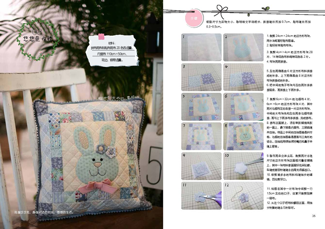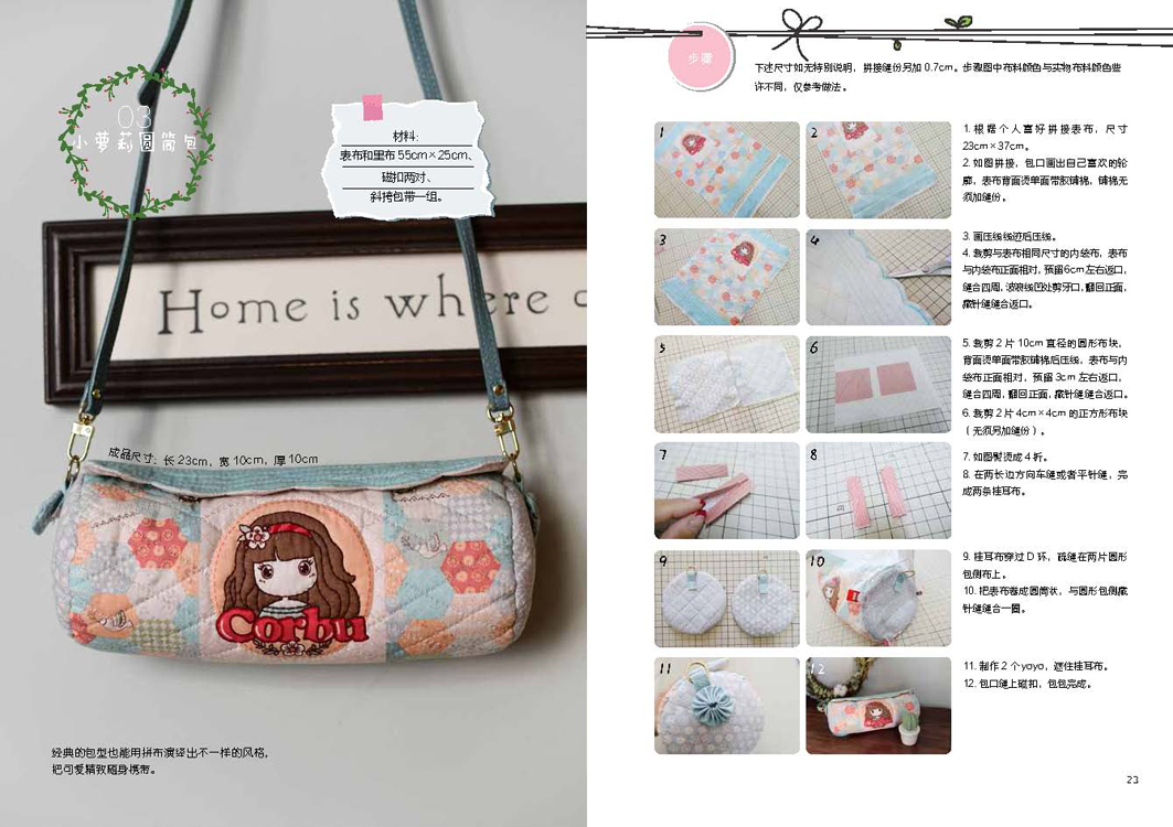 本书是一本详细讲解拼布技巧和拼布作品制作过程的的图书,无论是白领、文艺青年还是全职家庭主妇,也无论有没有缝纫经验,只要热爱手工、跟着作者的技法步骤一步步实践,都能动手尝试拼布,做出精致可爱的拼布作品。不需要沉重昂贵的工具和太长时间,也没有太繁琐的步骤,只需要用随手就能得到的边角布料,发挥自己天马行空的想象力,以及一点坚持、一点耐心。生活中每一个惊喜、每一段珍贵的回忆,都可以用拼布记录下来。在午后的温暖阳光下,拿起针线,时间在裁剪、手缝的过程之中悠然流淌。