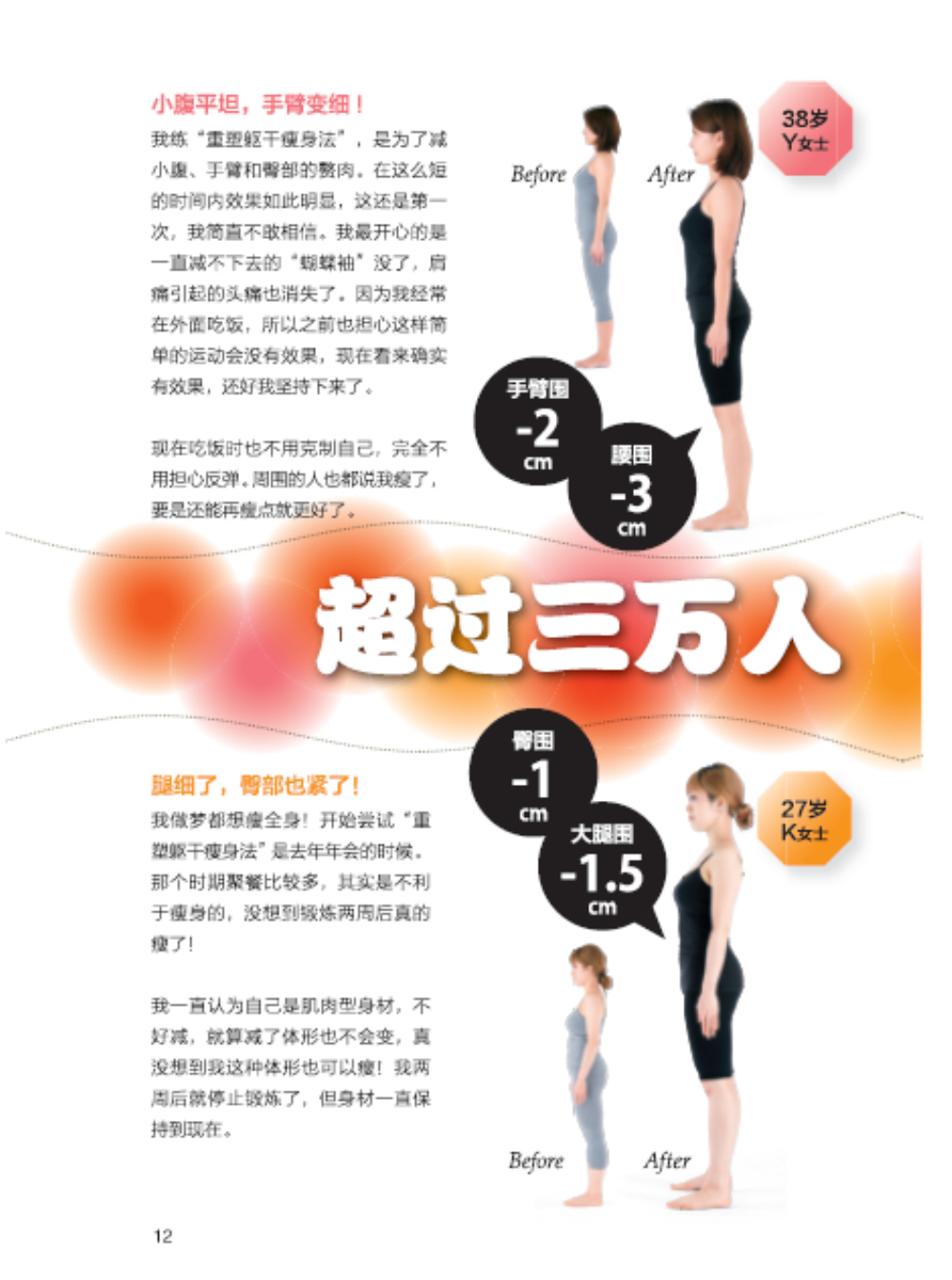 ★骨盆前倾、小腹前凸、小腹赘肉、蝴蝶袖等瘦身难题逐一突破,两周即有明显变化,即使停止练习,也不反弹。