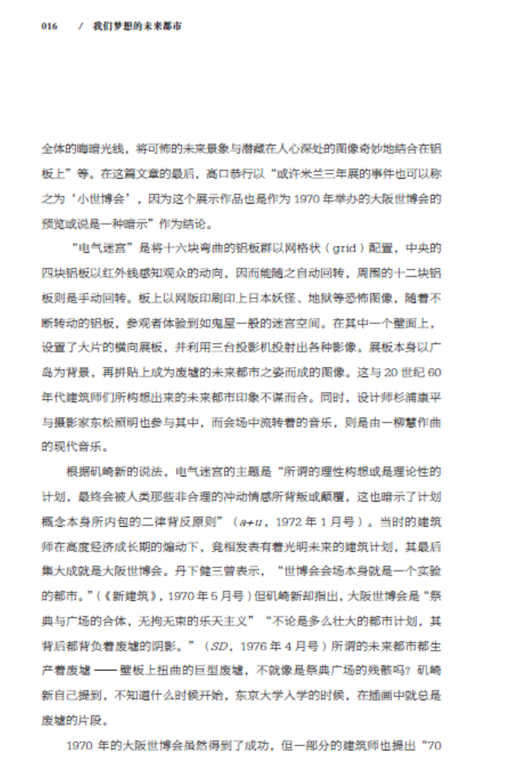 本书共分为“大阪世博会与20 世纪60 年代”“未来的两张面孔”“对于东京的想象力”“作为未来都市的东京”“近代乌托邦的系谱”“从乌托邦到科学”“亚洲与电脑”“虚拟空间的另一端”“21世纪视角与爱知县世博会”九个章节,详细阐述了日本两位建筑师五十岚太郎和矶达雄结合1970年的大阪世博会和2010年的上海世博会对“未来都市”的思考和对城市未来的构想。