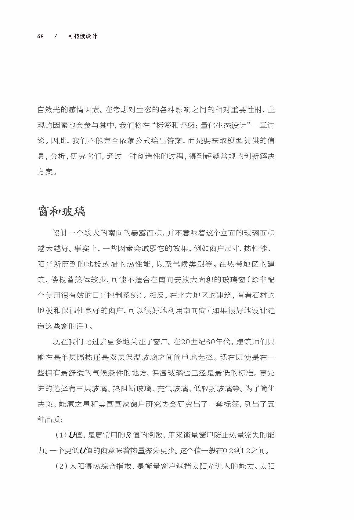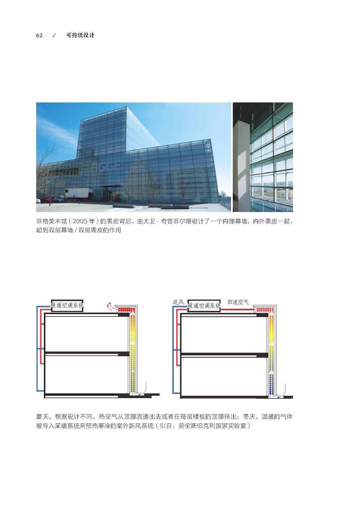 还有一些关于最佳解决措施的讨论。在这些例子中,可能没有唯一的答案,但是书中列出了各种观点和它们的优势、劣势。这些观点也一直在进化。随着我们在可持续设计领域经验的增长,知识也被颠覆着。今天的高科技解决方案还包含一些有待解决的问题,如“室内环境质量”一章中关于集约型建筑的讨论就是一个经典的例子。