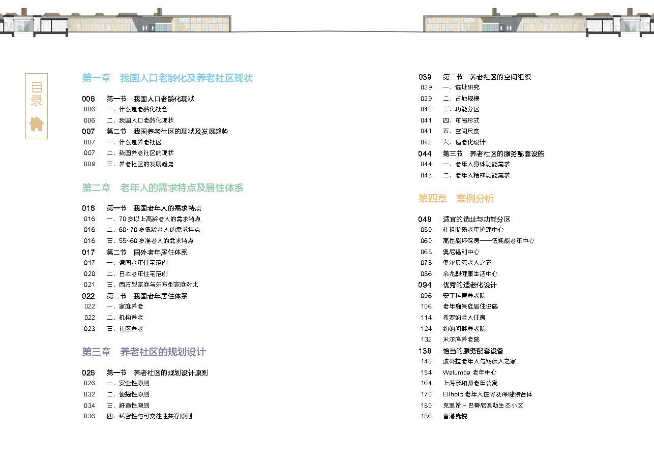本书作为一本养老社区的设计指南,从多个不同的方面对养老社区进行介绍。根据我国老龄化现象、经济情况及养老社区的现状进行具体分析,针对老年人的需求对养老社区的规划设计进行了详细的讲解,包括养老社区的规划设计原则、空间组织模式、建筑布局及服务配套设施。书中收录了多个精心筛选的不同类型的国内外的养老社区案例,图文结合,参考价值高。