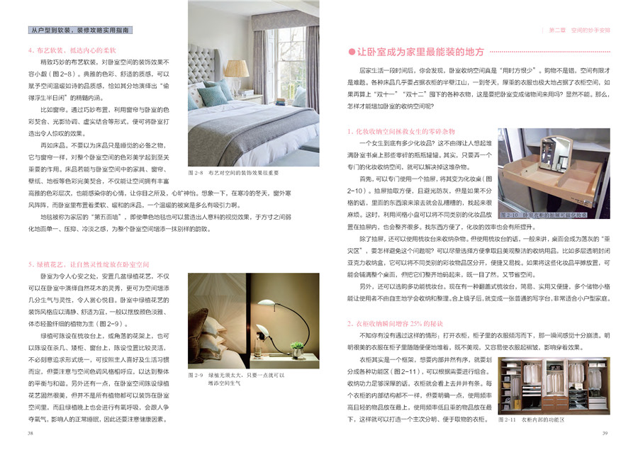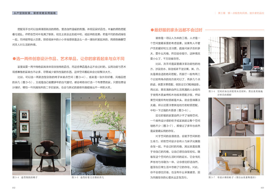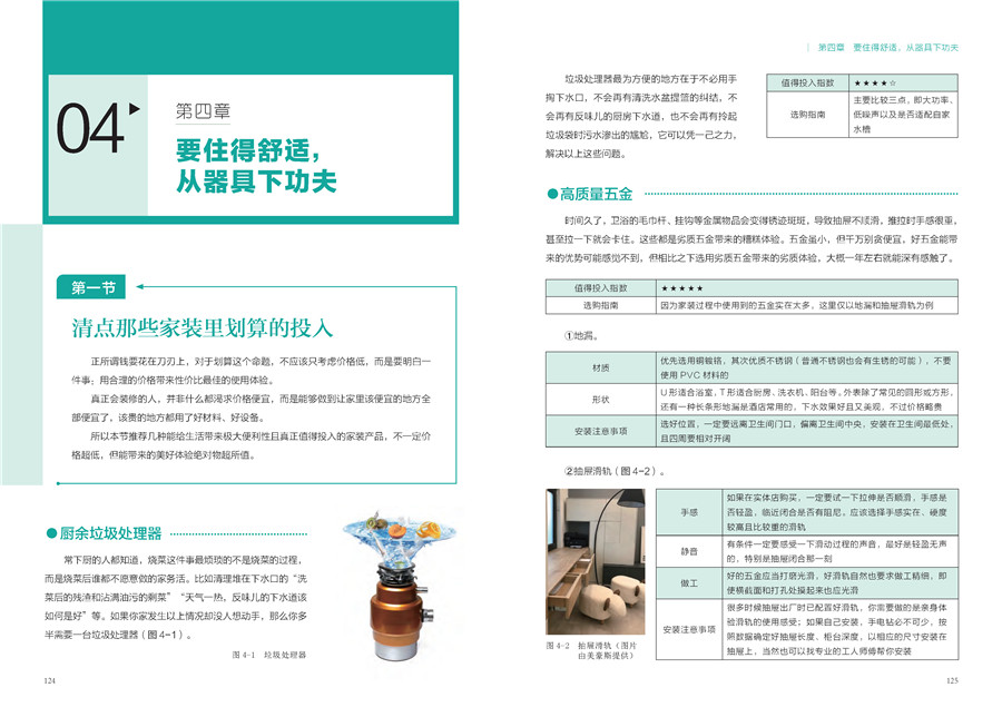 本书分为四部分:第一章为“装修时要做好的功课”,主要讲装修时有哪些地方需要注意,着重于细节;第二章为“空间的妙手安排”,从卧室、客厅、玄关、厨房、卫生间、阳台等分区入手,分别讲解各功能区的一些装修要点和建议;第三章为“懂一点配色和风格,提升家的品味”,主要从风格和配色入手,讲解各种风格的注意事项;第四章为“要住得舒适,从器具下功夫”,主要讲述有哪些实用好看的家具、部件,以及个别家具有哪些地方不尽如人意,需要谨慎购买。