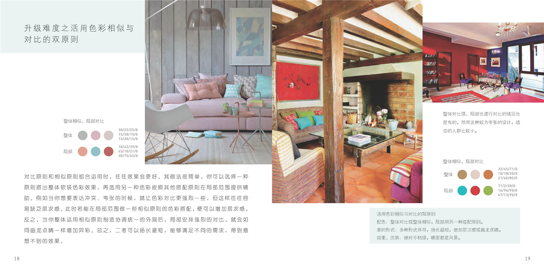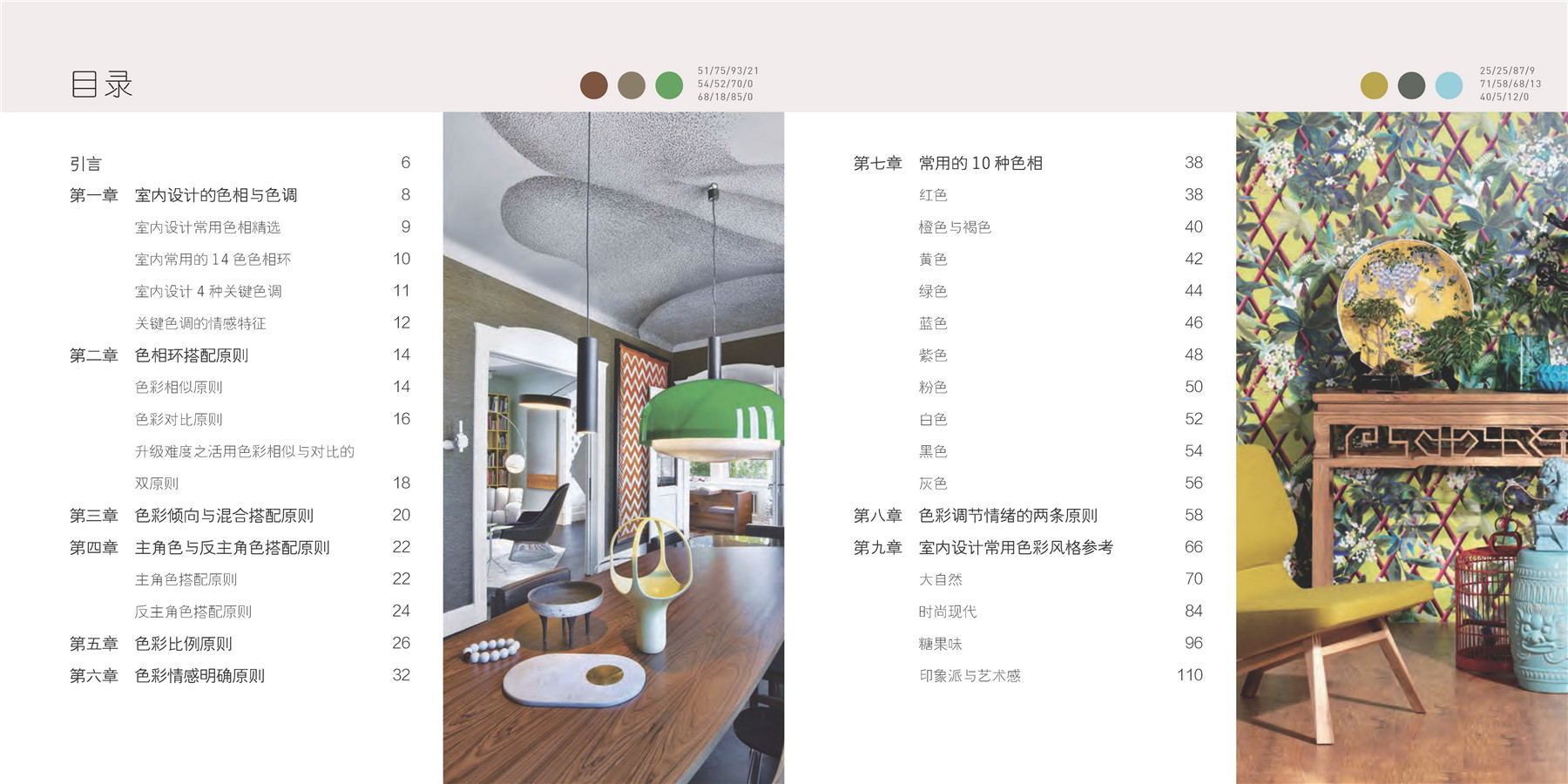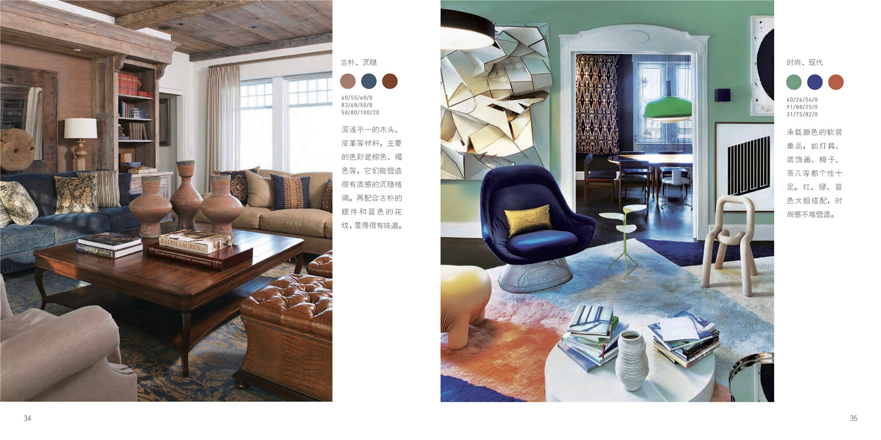 无论您是急于为客户做室内设计配色的设计师,还是想改变一下家居配色风格的普通读者,这本书都能为您提供令您满意的色彩搭配。不管您是喜欢时尚现代的风格,还是衷情于古典的风雅,抑或崇尚田园的自然,或许还有一点原木情结,甚至于您想让自己的居室有些禅意,都可以从书中找到相应的配色方案。CMYK的参数可以保证您准确定位色彩,配色比例可以让您一眼找到主角与配角。