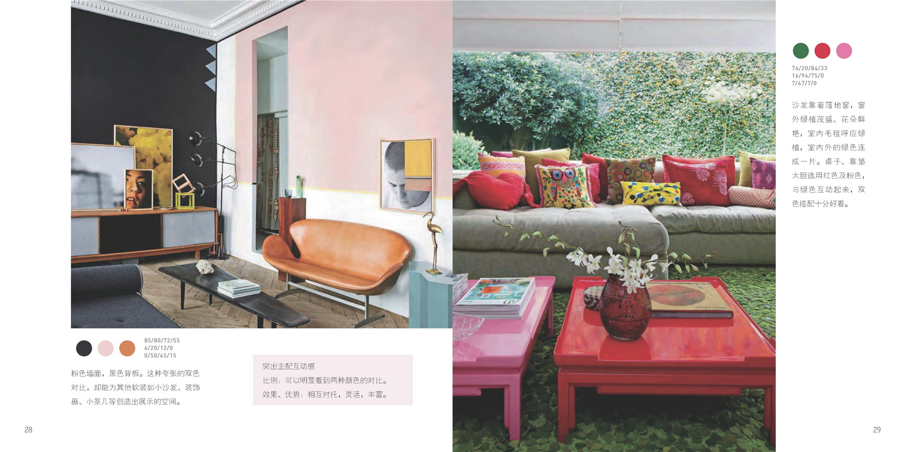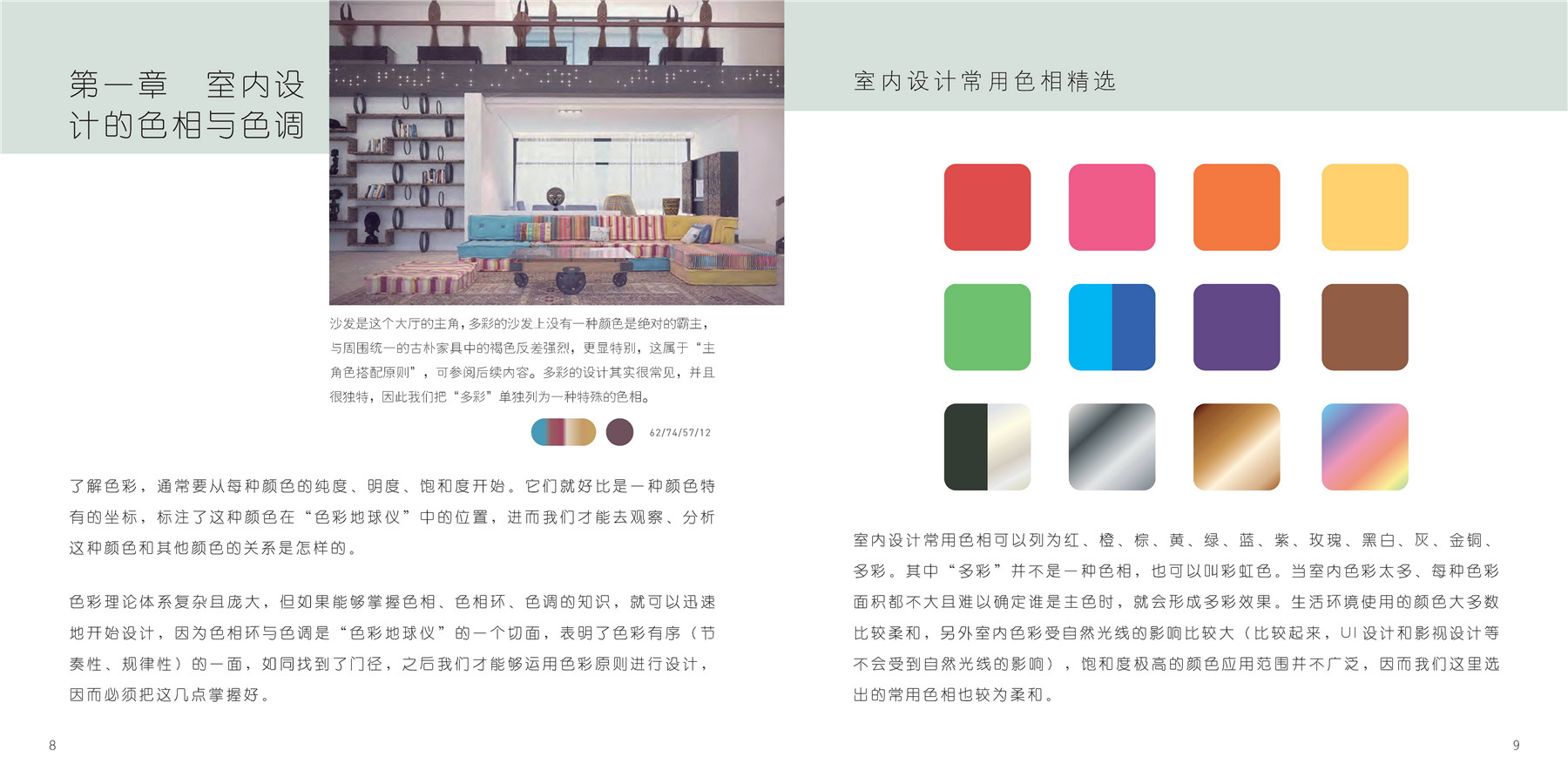 配色是室内设计中的重要一环,要做好配色,我们一方面应该掌握视觉色彩设计的总原则,一方面应该熟知室内色彩的特殊性。本书提供的色相、色调、色彩搭配参考就非常具有室内设计的特点。这几年室内设计用色越来越大胆、多元化,在注重色彩搭配的美感与个性的同时,我们也要注重色彩的功能性。色彩可以潜移默化地影响我们的情绪,还可影响身心健康。