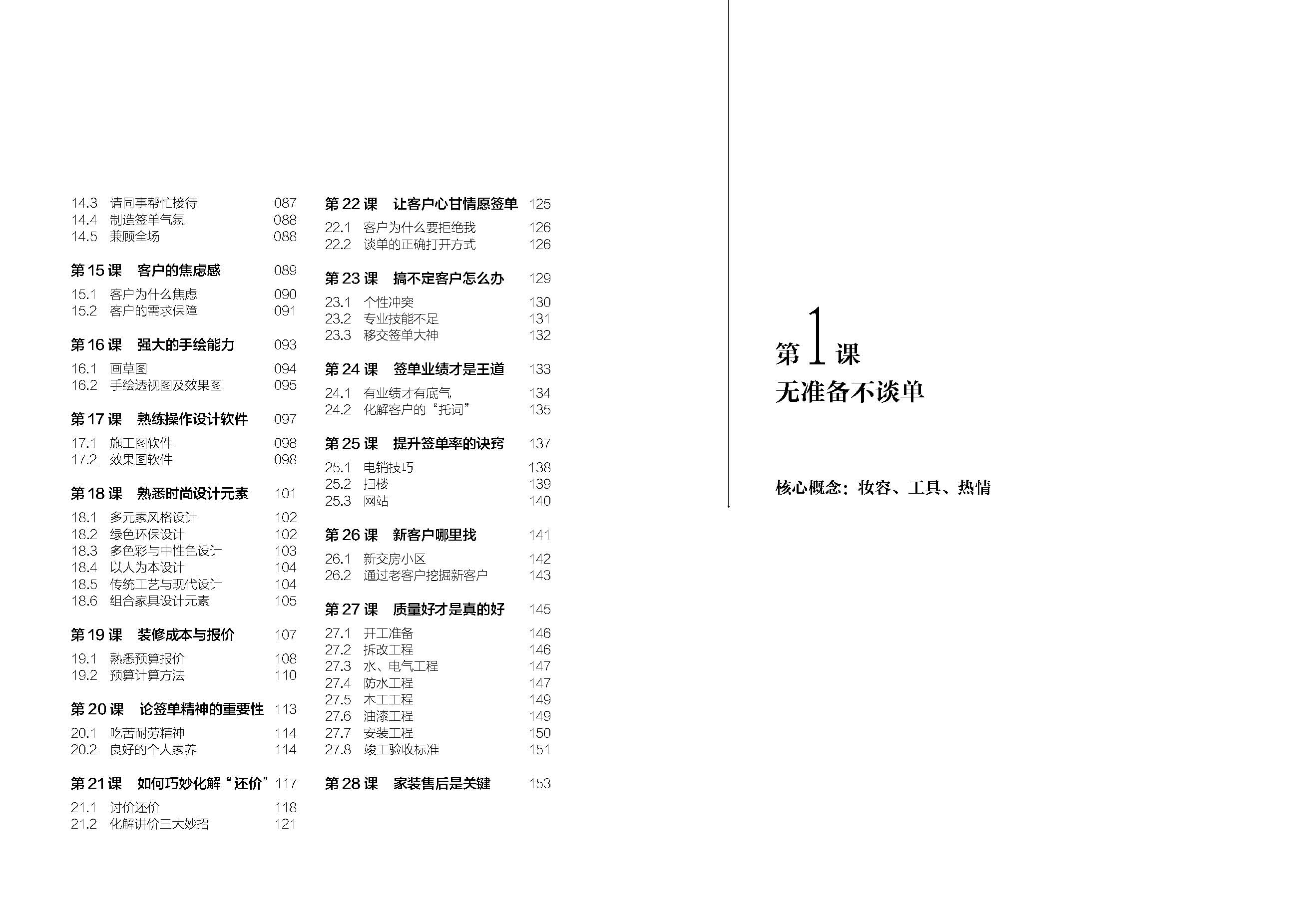 签单,是每个设计、装修行业从业者最重视的环节,但一个简单的词语后面,是诸多细节和实力的体现,设计师要具有的技能、各环节要注意的细节、与客户交流沟通的技巧、合作结束后关系的维护等等,都是影响能否签单的关键因素。本书总结了影响签单的28个关键点,详细介绍了每个关键点设计师应该如何做才能促成签单。每一步都简单易懂,操作性强,是家装行业新人进阶不可或缺的指导手册。