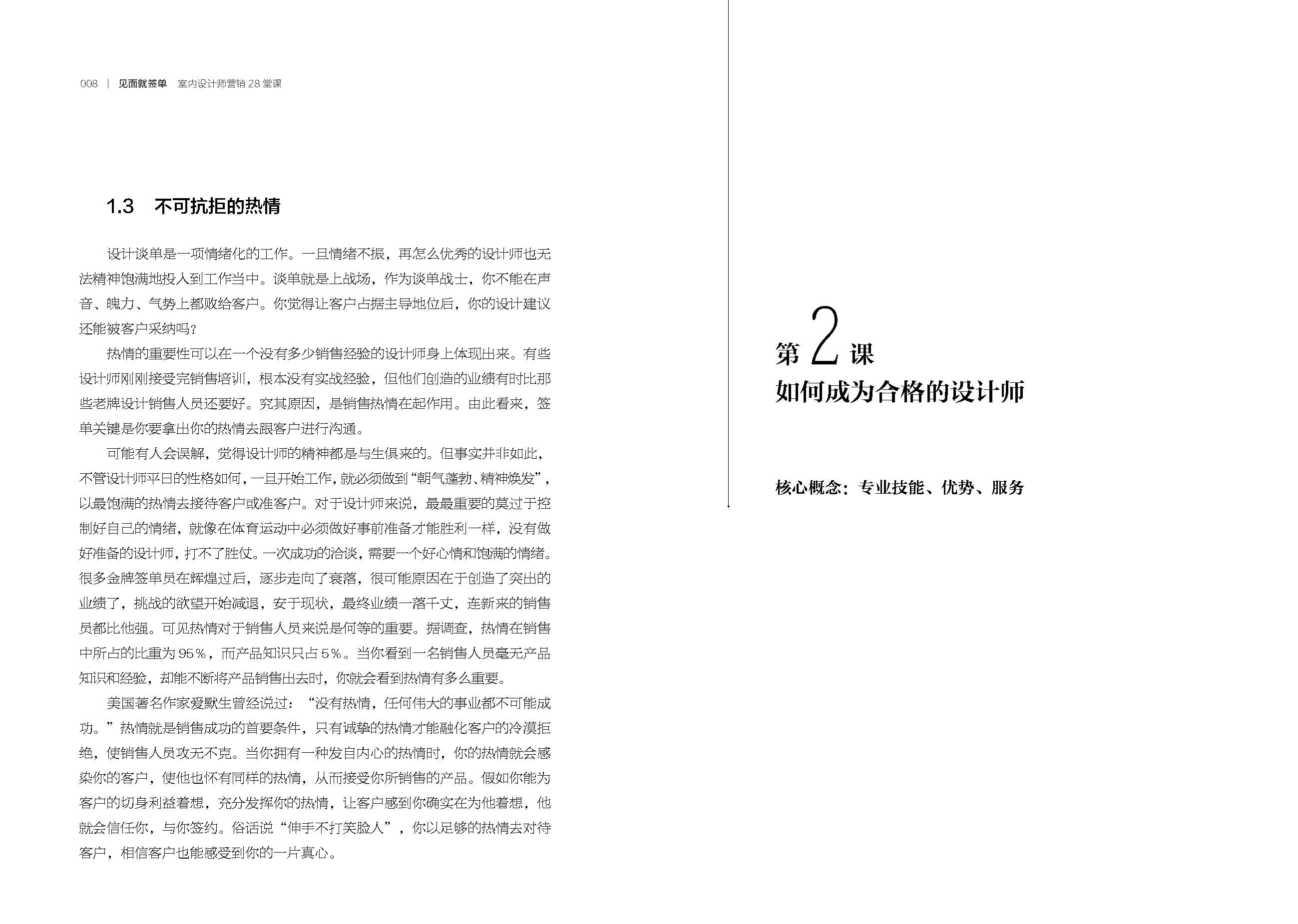 成为设计行业的佼佼者是每个设计者的初衷,然而现实却十分残酷,每年转行的设计师比比皆是,究其原因,大多是因为 “签单率”。作为一名合格的设计师,只会画图是不够的,现在电脑软件的普及,画图不再是设计师的秘密武器。为一名设计师,会谈会签已经是时代赋予设计师的新使命,而如何去谈并最终顺利签单,是众多设计师所面临的巨大难题。