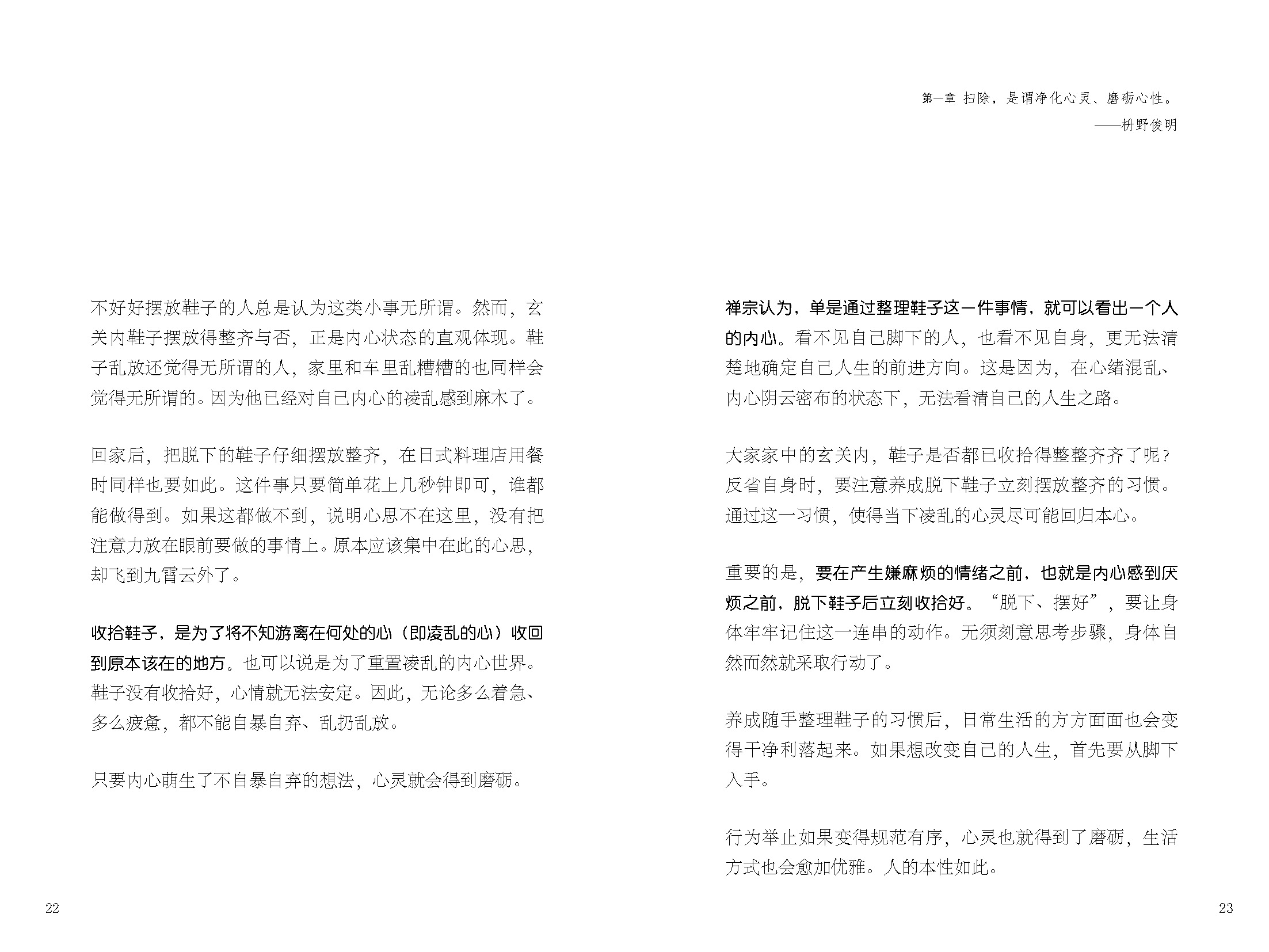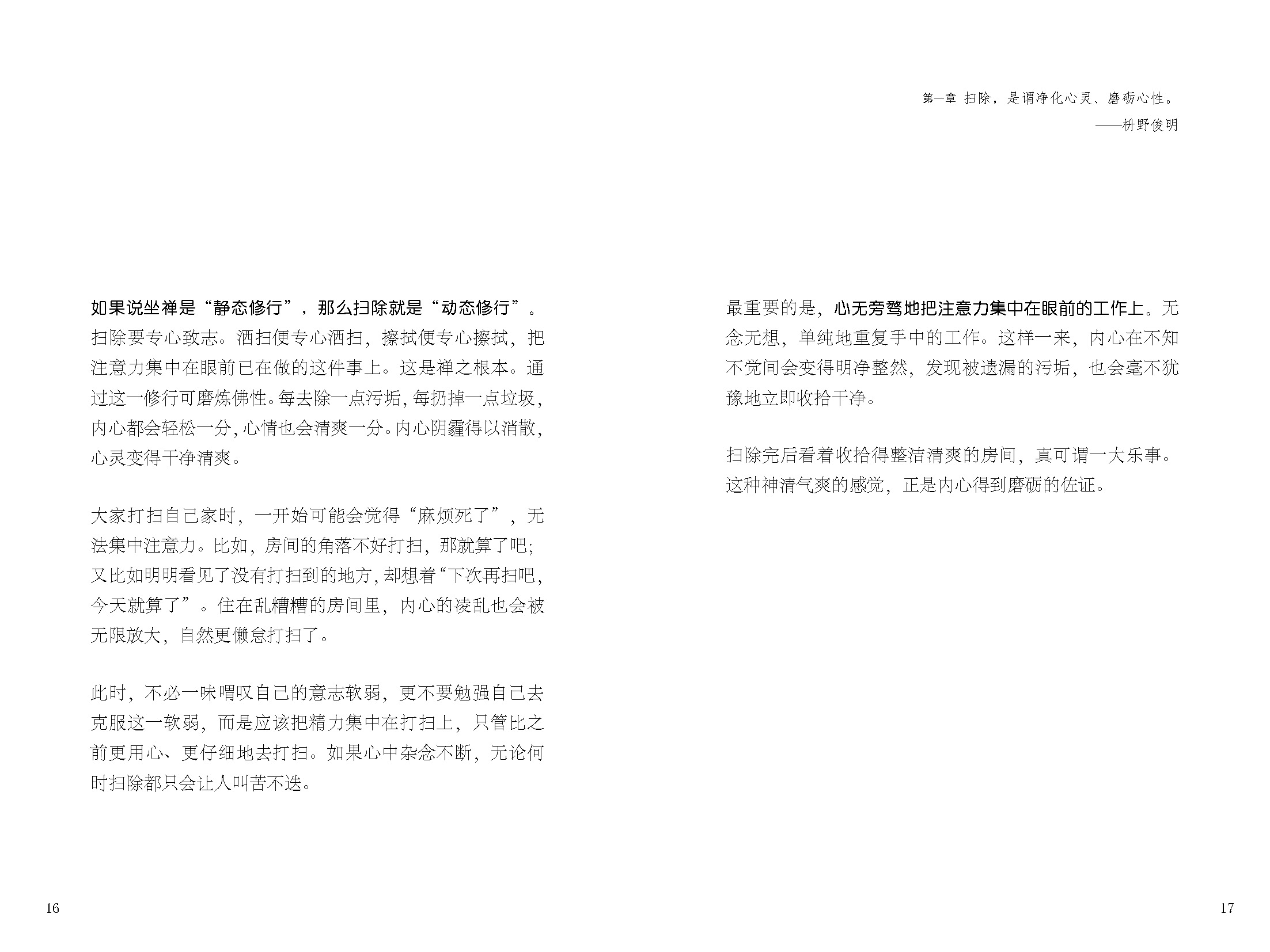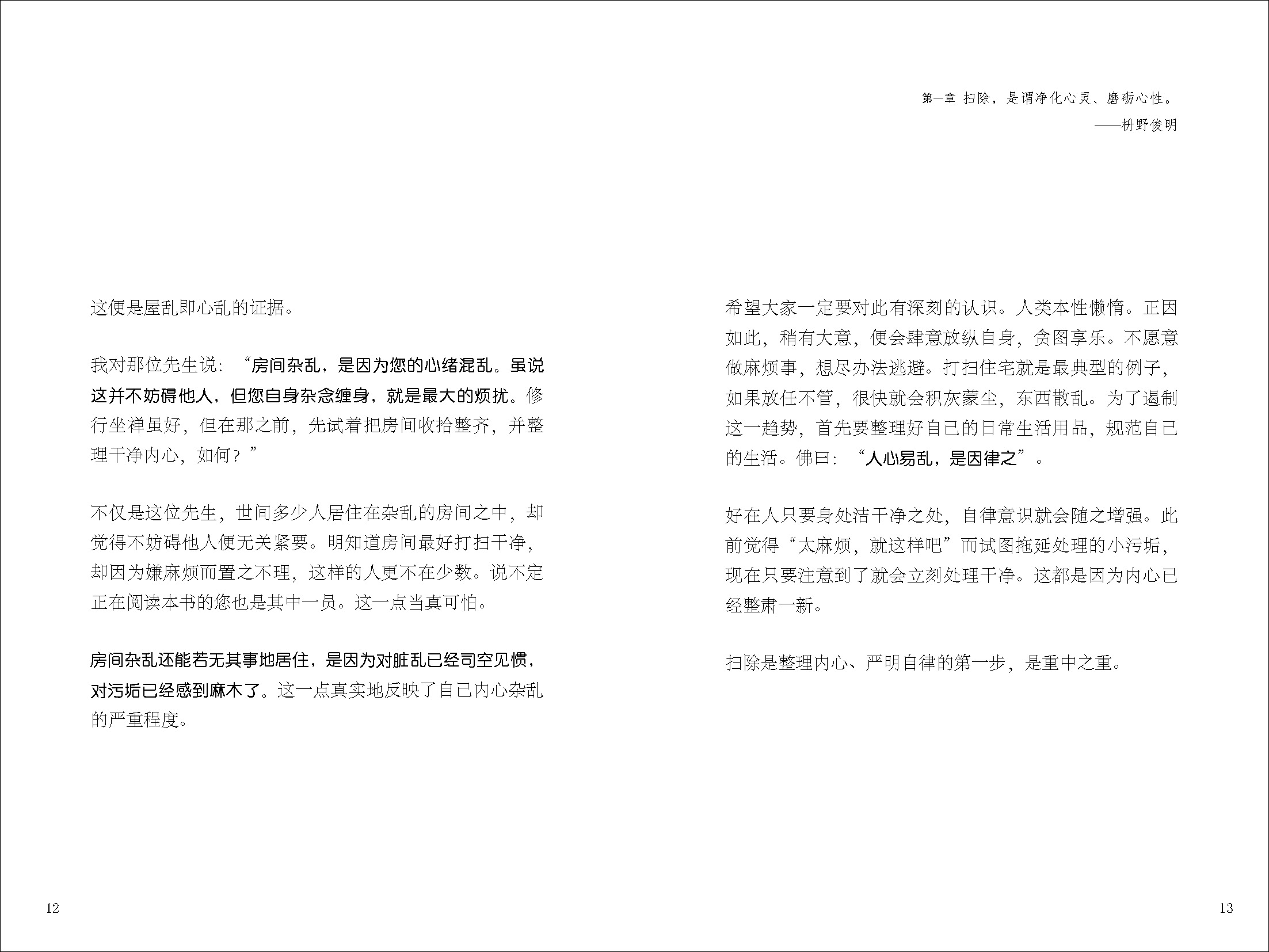 本书作者为日本禅学大师枡野俊明和扫除专家冲幸子,将禅学中扫除的智慧和欧洲极简整理术相结合,内容共分为三章:第一章,枡野俊明分享扫除与调和心灵的作用,即通过打扫外部环境来整理内心,去除不必要的执着和杂乱的心绪;第二章,冲幸子分享许多实用整理术及欧洲经验,她指出扫除困难的原因是物品太多,进而讲述舍弃物品的准则;第三章,枡野俊明与冲幸子对谈,融合东西双方关于扫除的观点与诀窍,意在使读者珍惜现有的一切,回归丰饶的初心,获得清爽简单的生活。