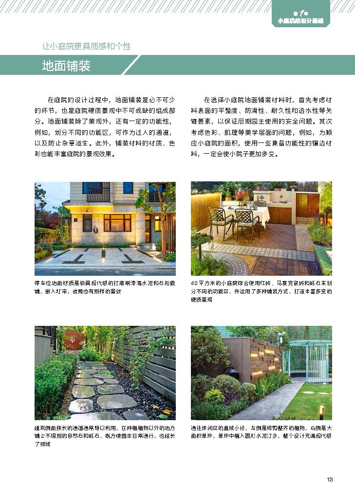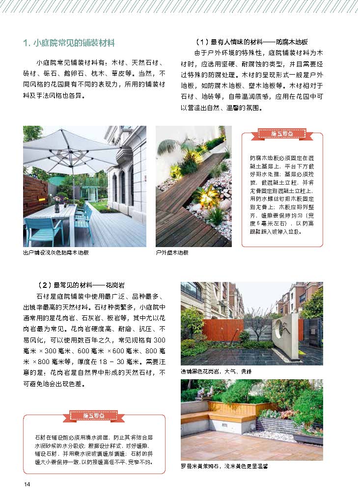 空间布局——巧妙利用空间,让小庭院显得更大;地面铺装——防腐木地板、花岗岩、砖石、砾石、鹅卵石等7大铺装材料的特征及铺装注意点;植物选配——48种适合小庭院的植物图鉴;草坪打造——冷暖季型草坪的对比分析,草坪的铺装要点以及4大地被植物推荐。