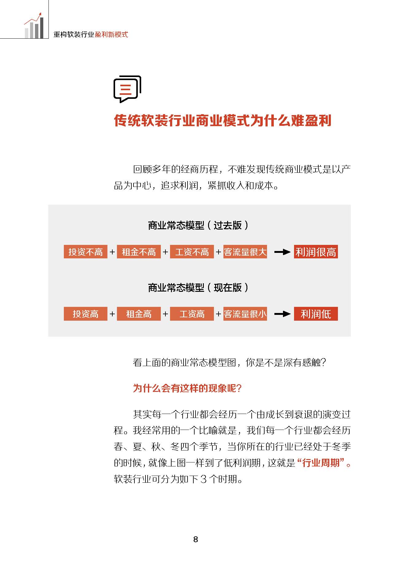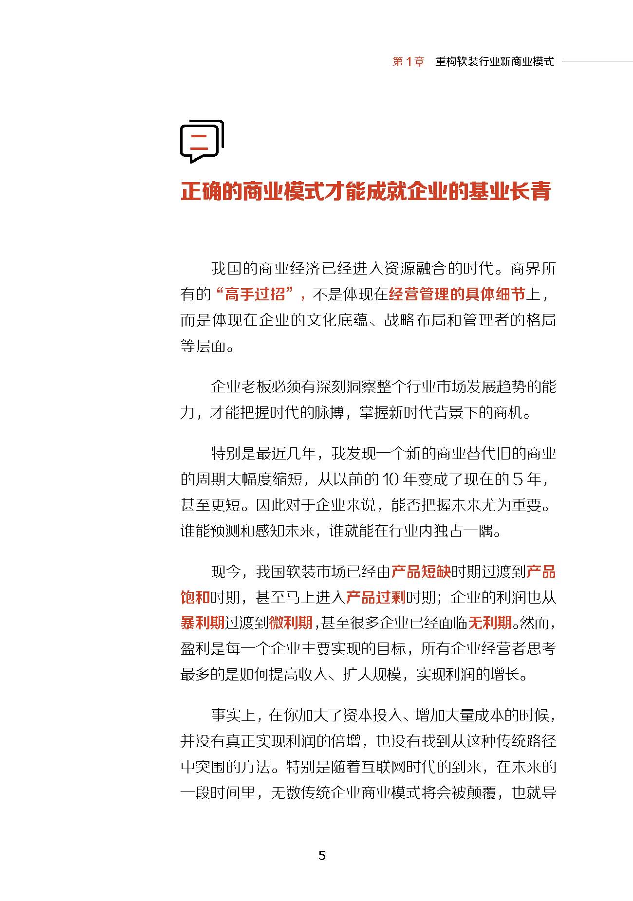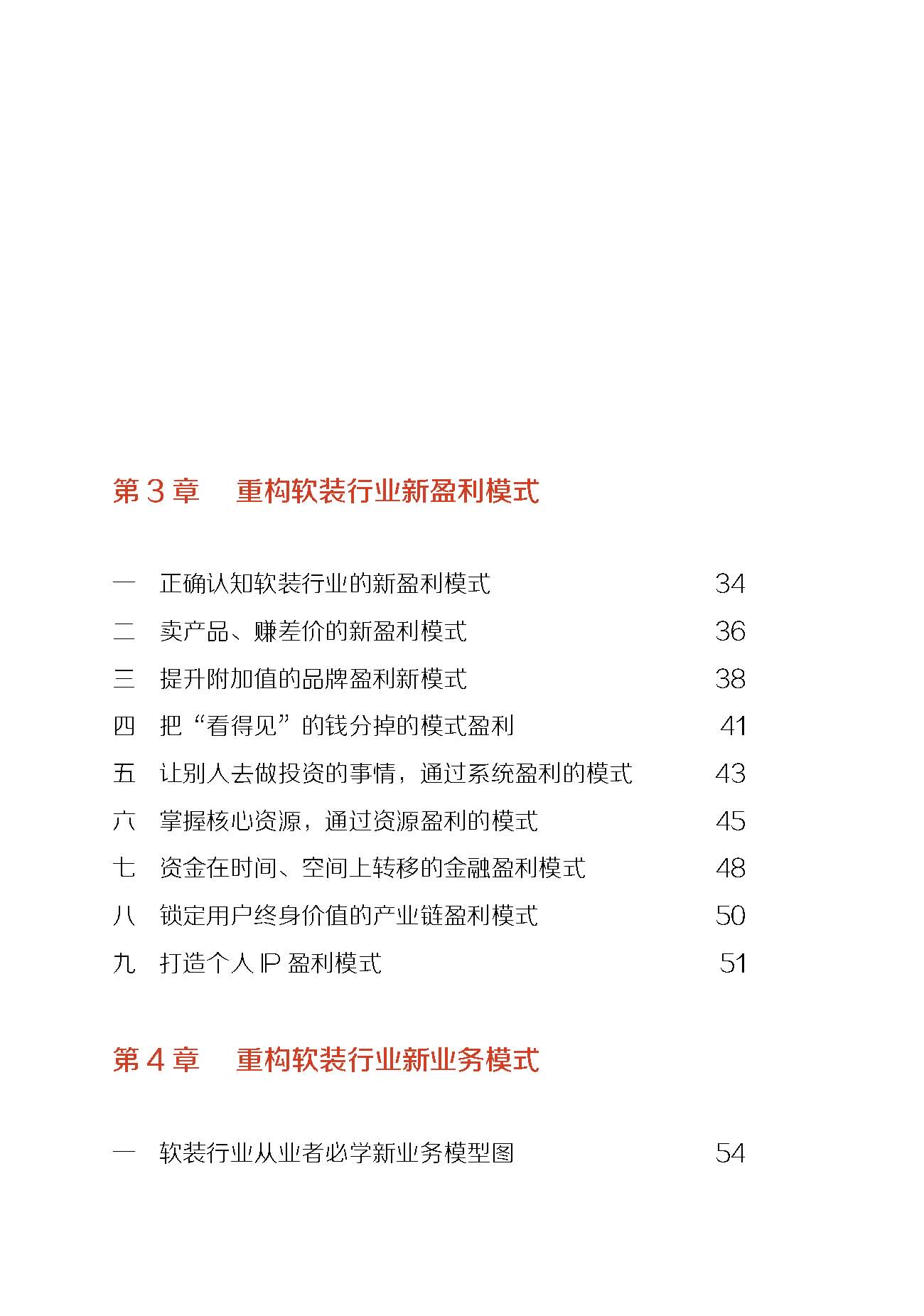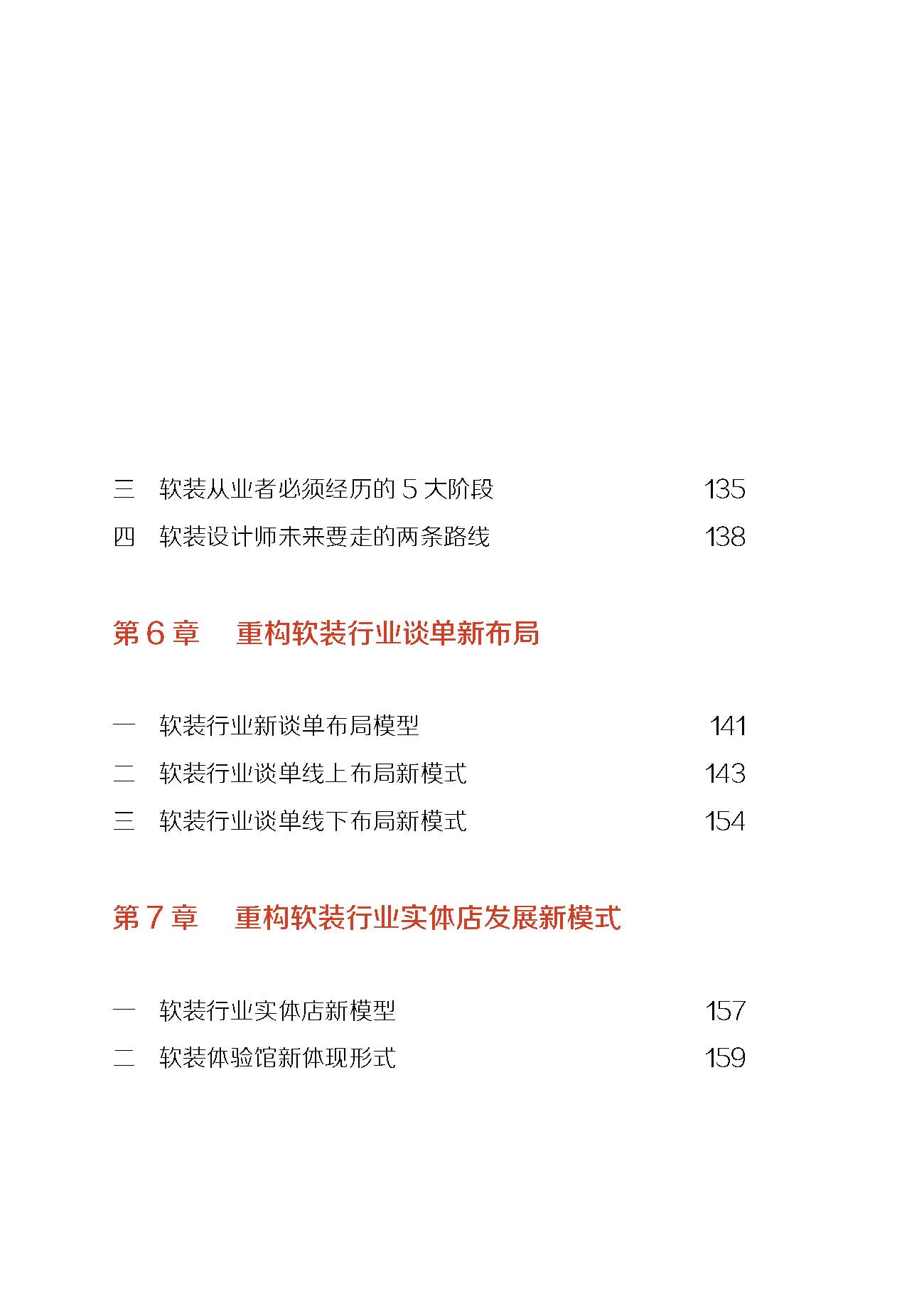 在书中,您将会看到传统软装行业商业模式为什么盈利难,新时代企业必须具备的流量、平台、跨界的思维,如何让资金再时间、空间上进行转移,如何让客户主动替您销售,高成交率的微信广告群发技巧,5G时代短视频获客新手段,软装从业者必须经历的5大阶段,以及软装设计师应该掌握的15个新技能和未来要走的两条路线。