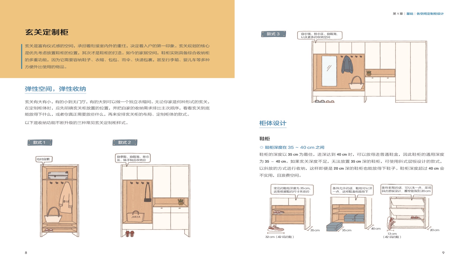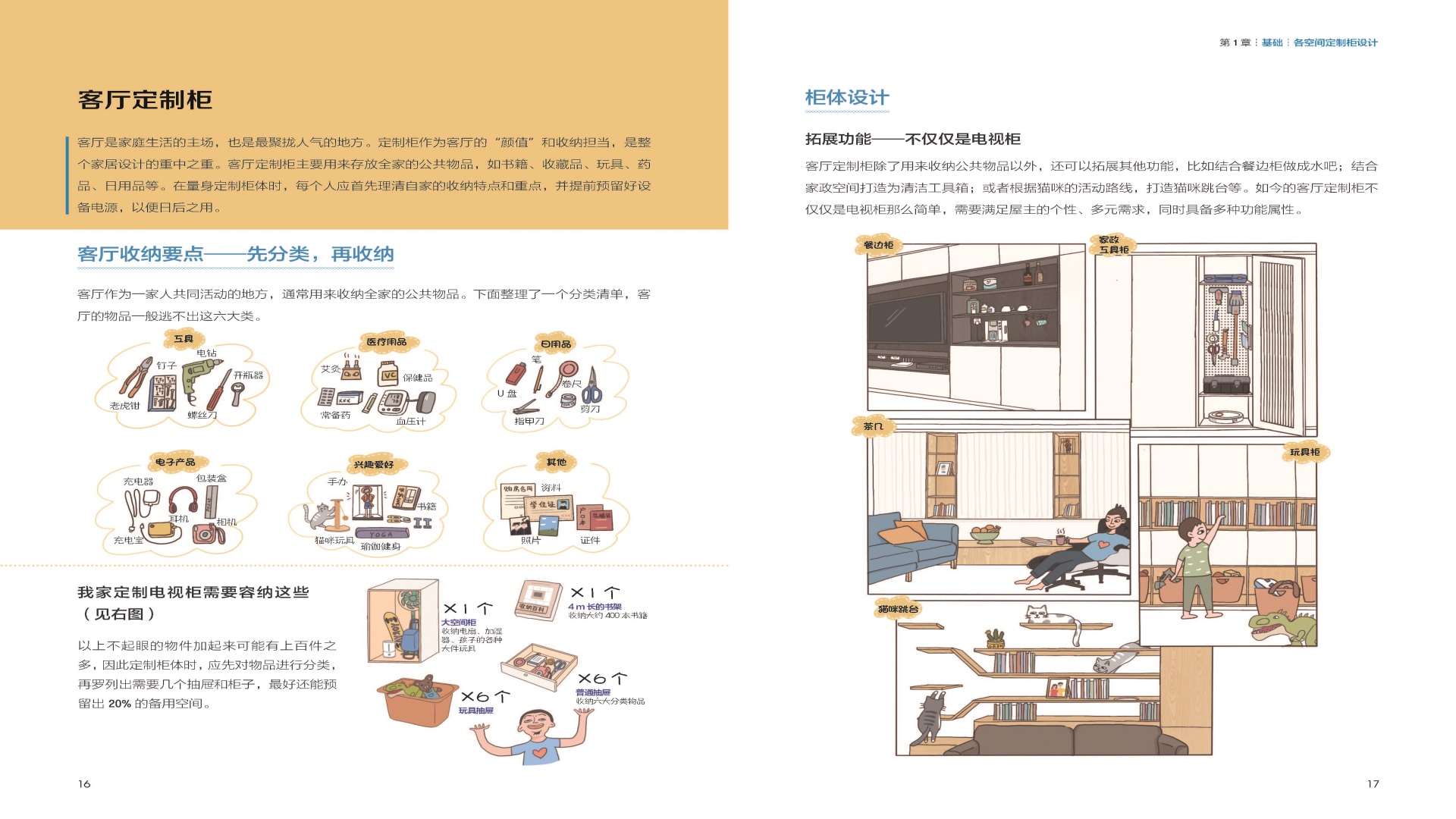 200+手绘插图,轻松活泼,降低理解门槛,玄关、客厅、厨房、餐厅和卧室定制柜设计详解,将定制柜设计与空间属性紧密结合;精心绘制26幅定制柜详解图,拿来就能用。