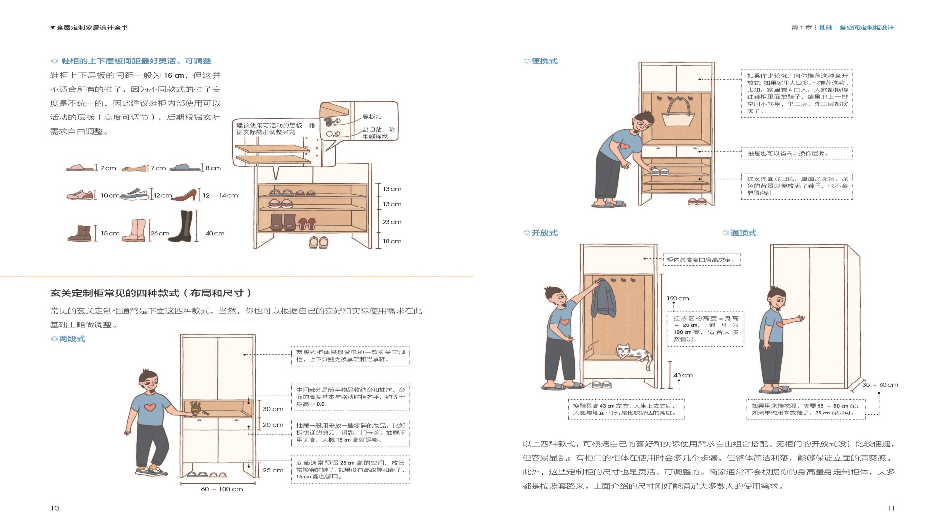 特别收录家居生活用品尺寸图鉴——生活日用品尺寸全览,符合人体工程学的定制柜尺寸大公开:玄关柜进深、吊柜和地柜的舒适高度,以及衣柜第一层搁板的高度等,全干货完全呈现。